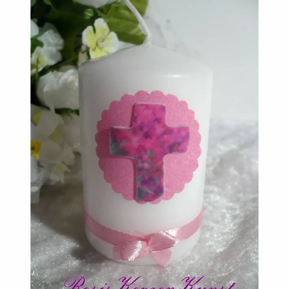 Hier bieten wir Ihnen kleine trendige Gastgeschenke-Kerzchen. Im Mittelpunkt steht das Kreuz, daß auf einem runden Wachstag aufgebracht wurde. Ein rosa Satinschleifchen gibt der Kerze das besondere Etwas.