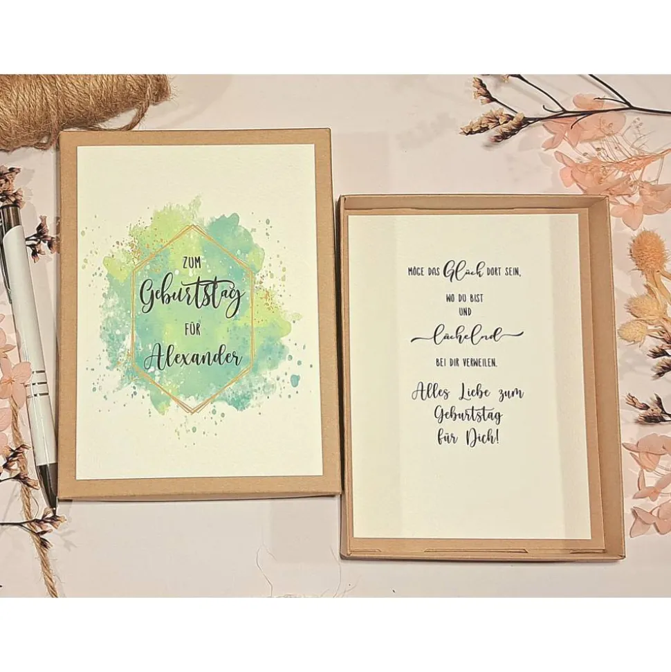 Bist du auf der Suche nach einer stilvollen Verpackung für ein Geldgeschenk? Diese hochwertige Geschenkbox aus Kraftkarton begeistert mit einem farbenfrohen Künstler-Design und wird individuell mit dem Namen des Geburtstagskindes personalisiert.