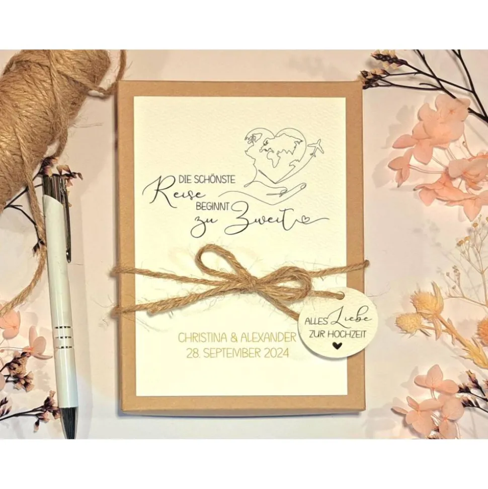 Überrasche das Brautpaar mit einer personalisierten Geldgeschenkbox zur Hochzeit! Diese elegante Geschenkverpackung ist die perfekte Wahl für Geldgeschenke zur Hochzeit oder zum Ehejubiläum. Mit Namen des Paares und dem Hochzeitsdatum personalisiert, wird sie garantiert zum Hingucker auf jeder Feier.