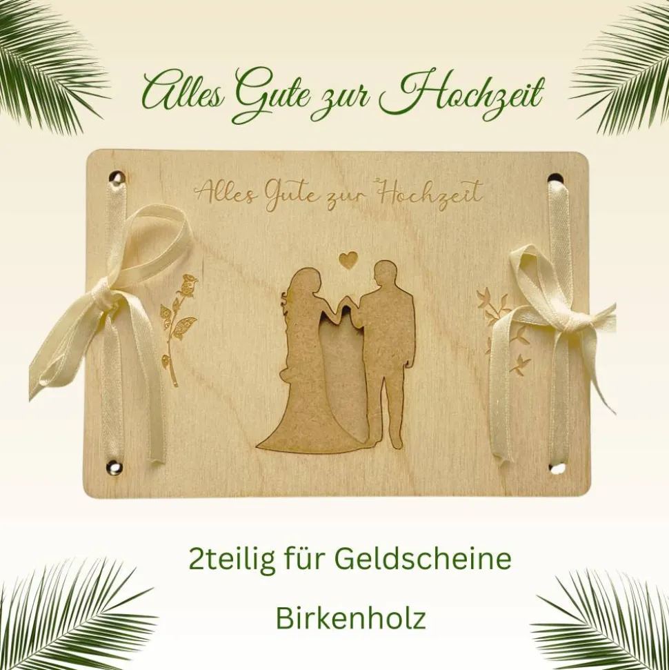 Auf Wunsch kannst du die Holzkarte individuell mit den Namen des Brautpaars und dem Hochzeitsdatum gravieren lassen. Damit verleihst du deinem Geldgeschenk eine ganz persönliche Note, die garantiert in Erinnerung bleibt.