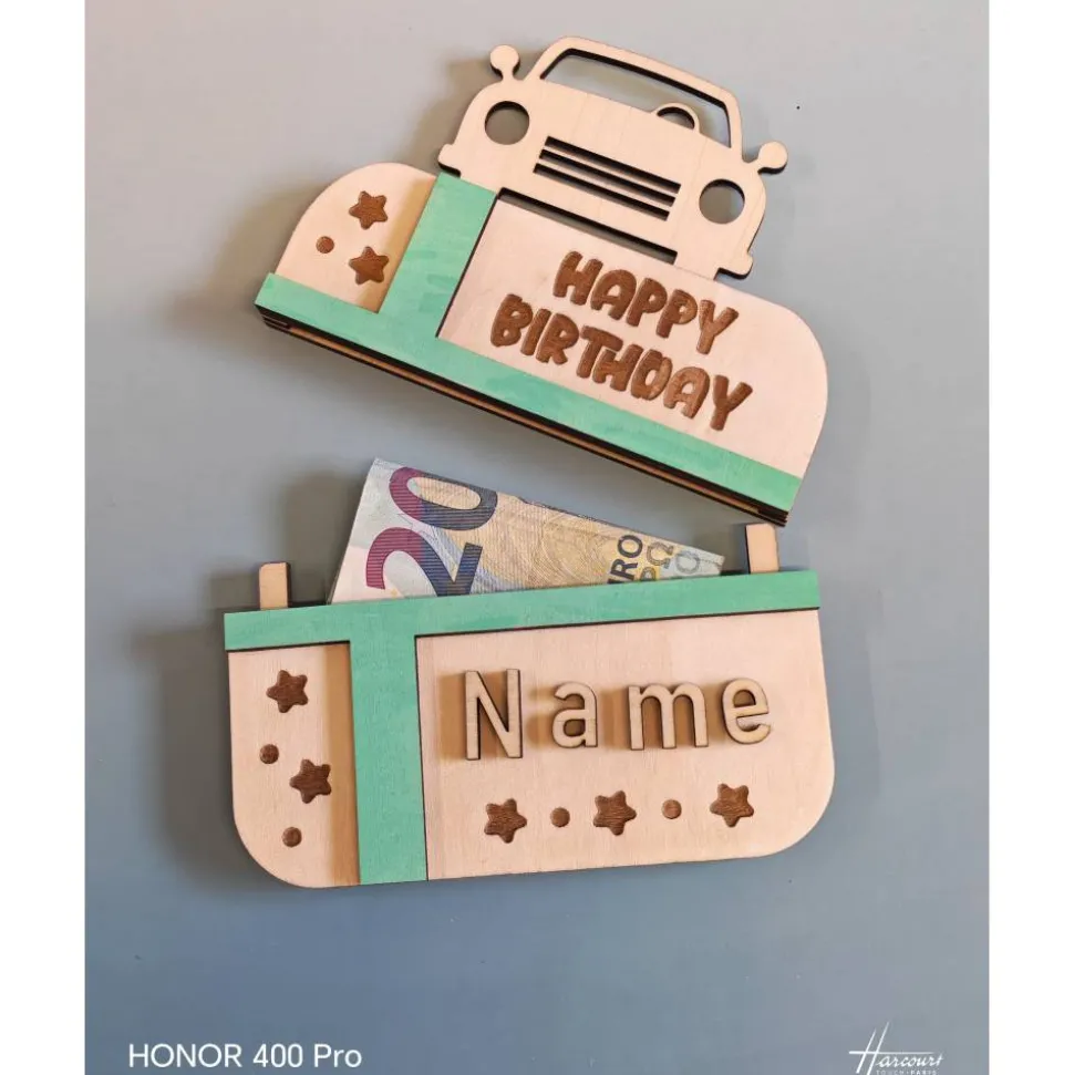 Entdecke die perfekte Geschenkidee zum Geburtstag: Mit dieser liebevoll gestalteten Geldscheinverpackung aus Holz verschenkst du Geld oder Gutscheine auf kreative und stilvolle Weise. Die hochwertige Gutscheinverpackung überzeugt durch individuelles Design und persönliche Gravur deines Wunschnamens – so wird dein Präsent garantiert zum unvergesslichen Hingucker!