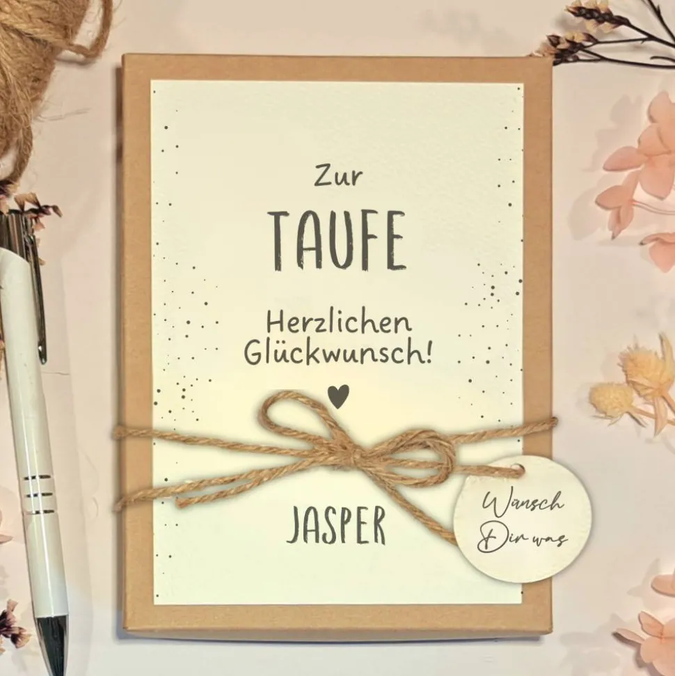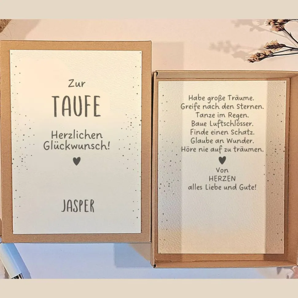 Suchst du ein besonderes Taufgeschenk für Jungen oder Mädchen, das dauerhaft in Erinnerung bleibt? Diese hochwertige Geschenkbox zur Taufe wird individuell mit dem Namen des Täuflings personalisiert und beeindruckt durch den minimalistischen Stil. Der dezente Schriftzug „Zur Taufe“ sowie der edle Strukturkarton machen jede Box zu einem absoluten Einzelstück.