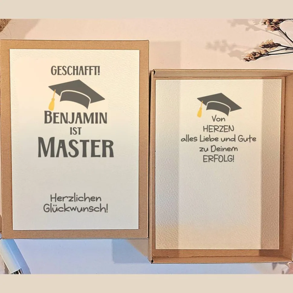 Feiere den Masterabschluss mit einer einzigartigen, personalisierten Geschenkbox! Diese elegante Box aus stabilem Kraftkarton ist die perfekte Verpackung für dein Geldgeschenk oder kleine Überraschungen und sorgt garantiert für strahlende Augen beim Absolventen.