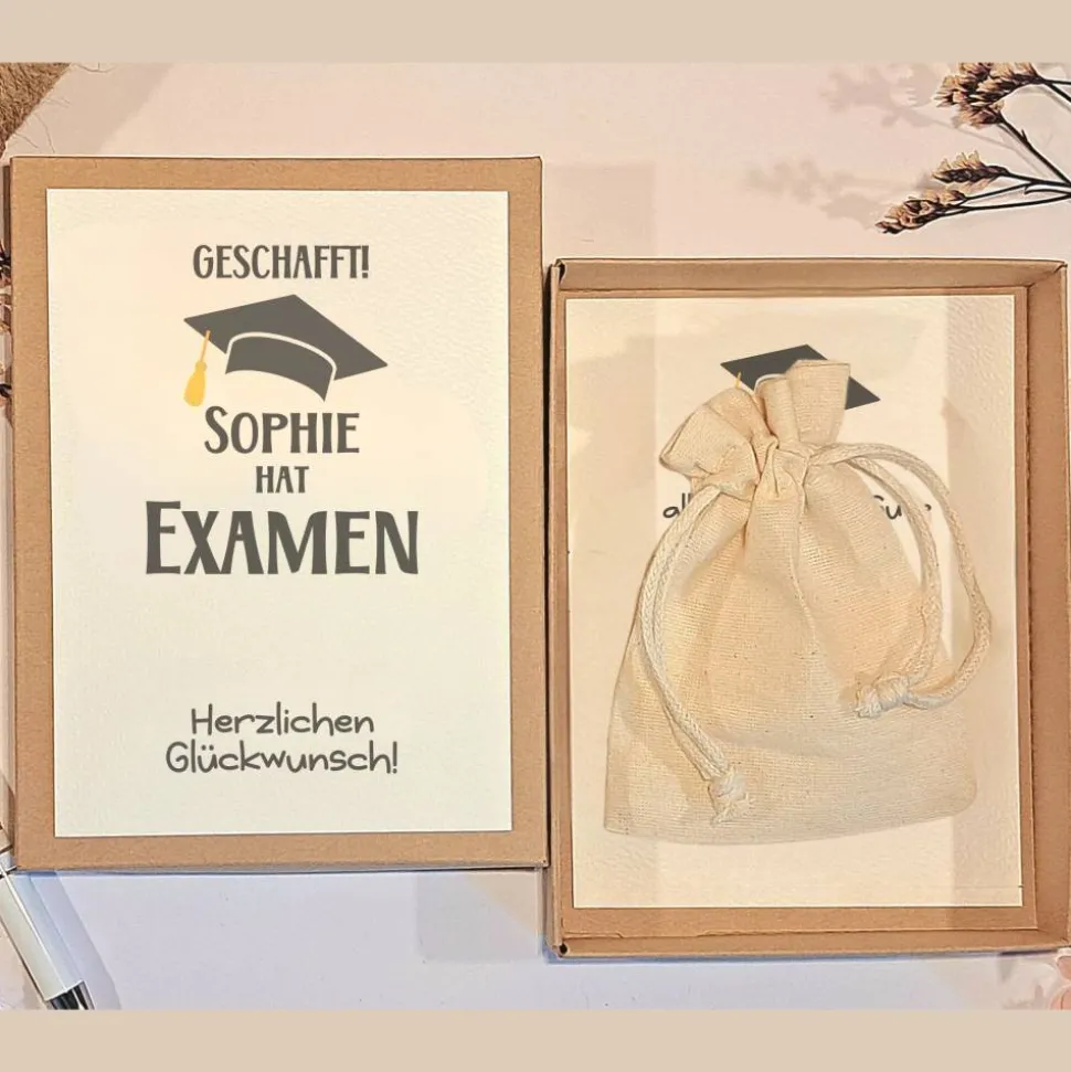Du suchst ein besonderes Geldgeschenk zum bestandenen Examen? Mit dieser personalisierten Geschenkbox überreichst du deine Glückwünsche stilvoll und unvergesslich. Der Name des Absolventen wird individuell auf der Vorderseite aufgedruckt und macht dein Präsent einzigartig.
