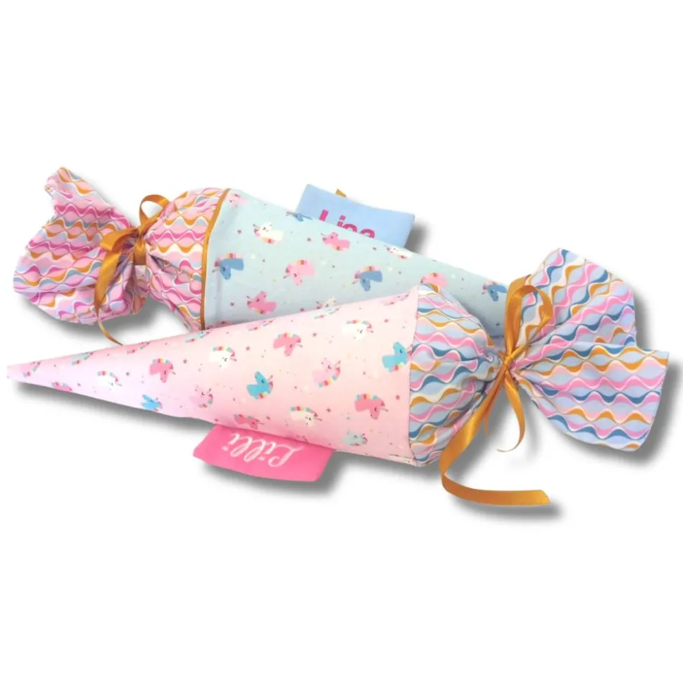 Wähle gemeinsam mit deinem Kind aus vier Stoffvarianten (rosa oder blaue Einhörner, rosa oder blaue Rauten) und stelle so eine individuelle Zuckertüte zusammen. Personalisiere den Namen in Schreibschrift oder Druckschrift und in deiner Wunschfarbe – ein echtes Unikat!