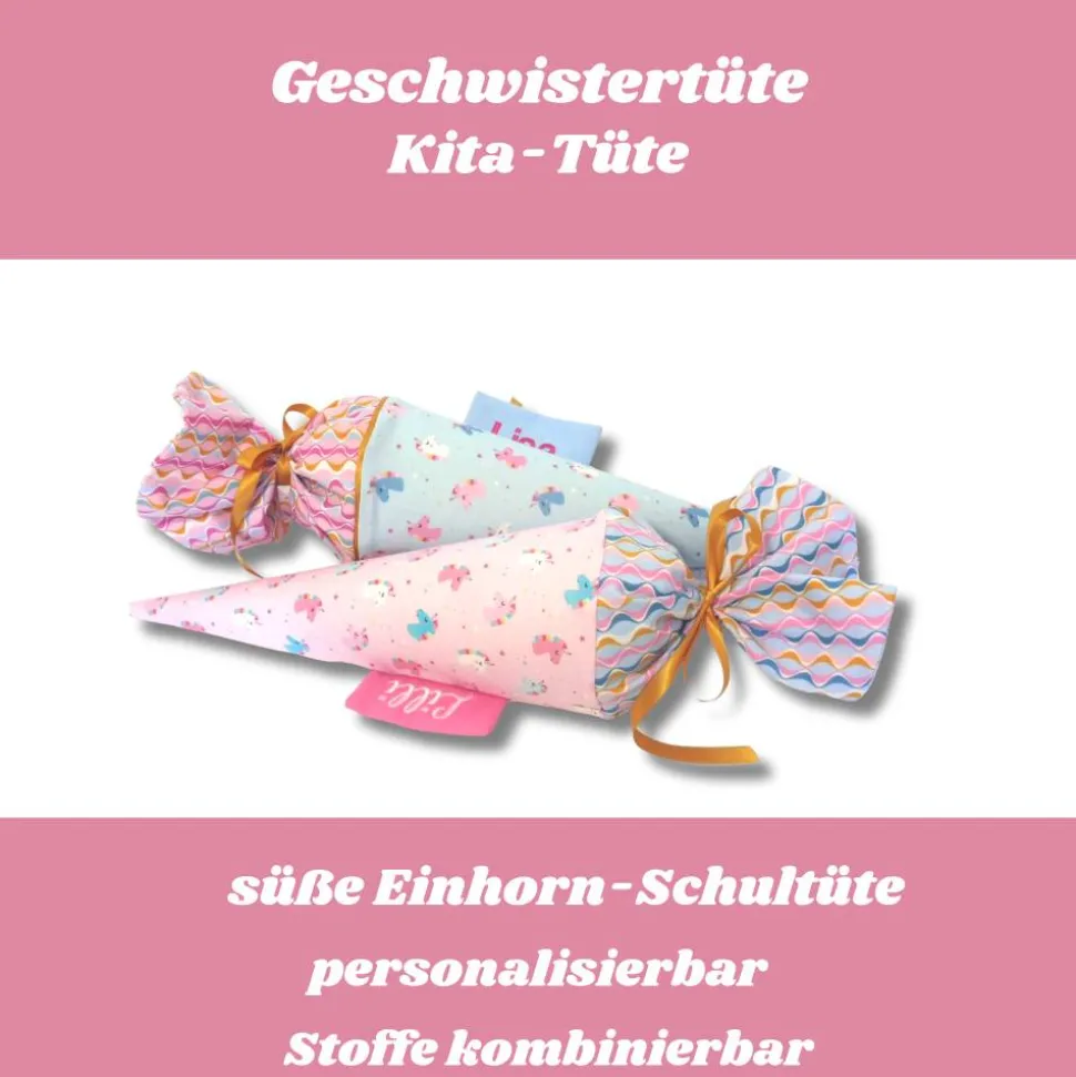 Feiere den ersten Kindergartentag mit einer einzigartigen, personalisierbaren Einhorn Geschwistertüte! Dein kleiner Liebling wird diesen besonderen Moment mit einer zauberhaften Schultüte aus hellblauem oder rosa Baumwollstoff, bedruckt mit niedlichen Einhörnern, lieben. Im oberen Bereich sorgt ein buntes Rautenmuster in fröhlichen Farben für gute Laune.
