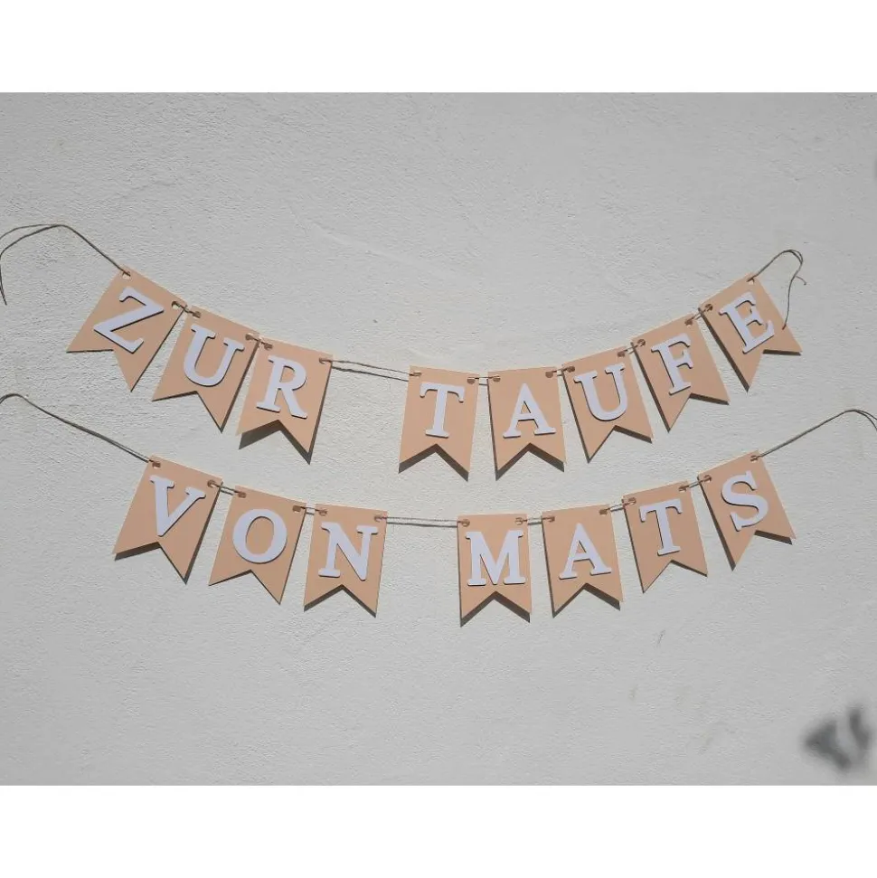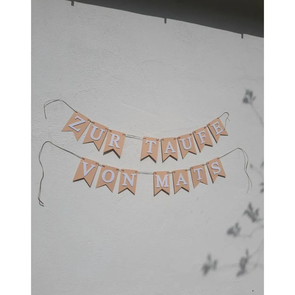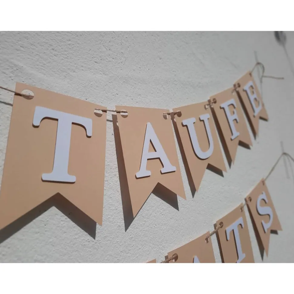 Wunderschöne Girlande zur Taufe. Auf Wunsch personalisiert mit dem Namen des Taufkindes. In hellem Beige mit klarer weißer Schrift mit plastischem 3D Effekt. Aus hochwertigem Karton von Hand zusammen gesetzt.