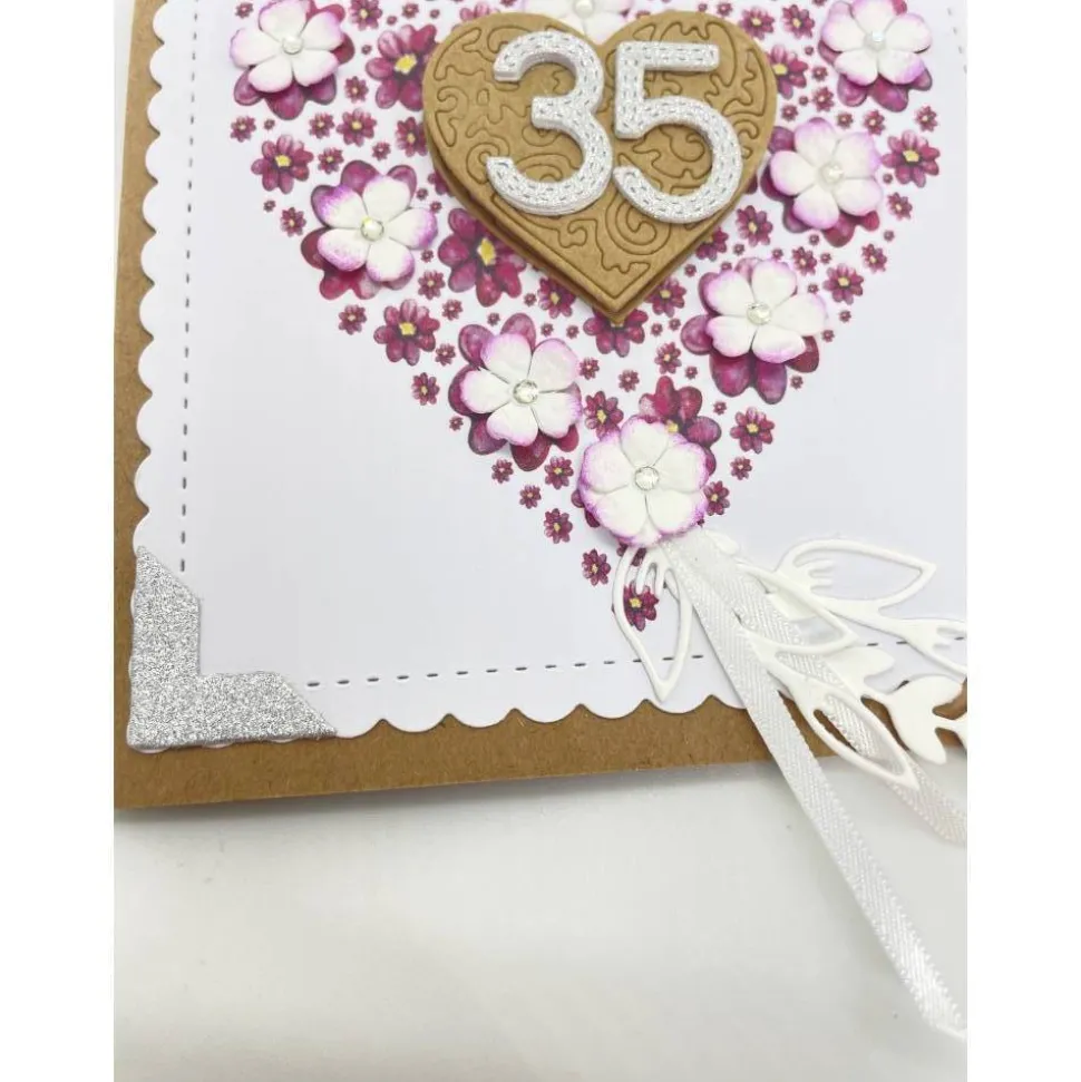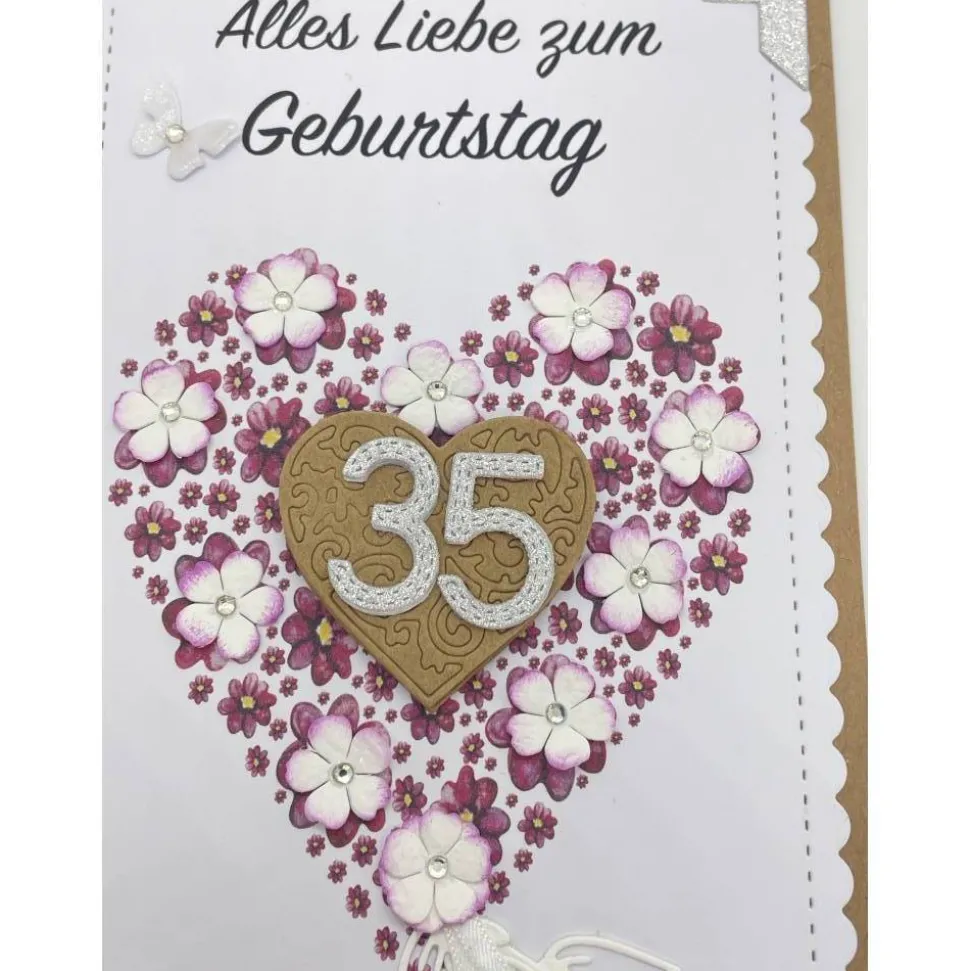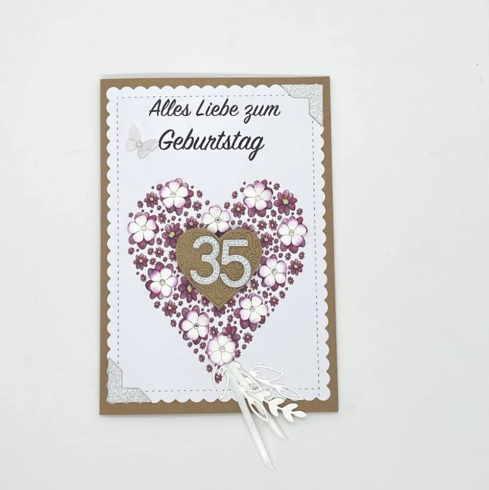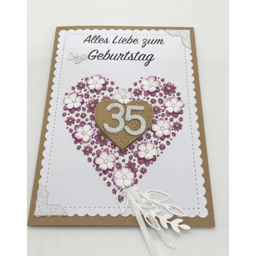 Entdecke eine einzigartige, handgefertigte Glückwunschkarte mit einem kunstvoll gestalteten Blumenherz und deiner gewünschten Zahl für einen besonderen Geburtstag oder ein Jubiläum. Jede Karte ist mit viel Liebe zum Detail gefertigt, veredelt mit einem Schleifenband, kleinen Blümchen und einem funkelnden Strassstein, der für einen edlen Glanz sorgt.