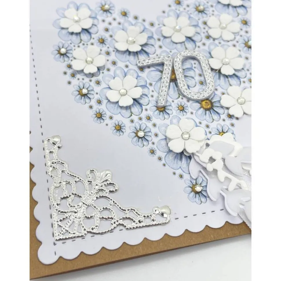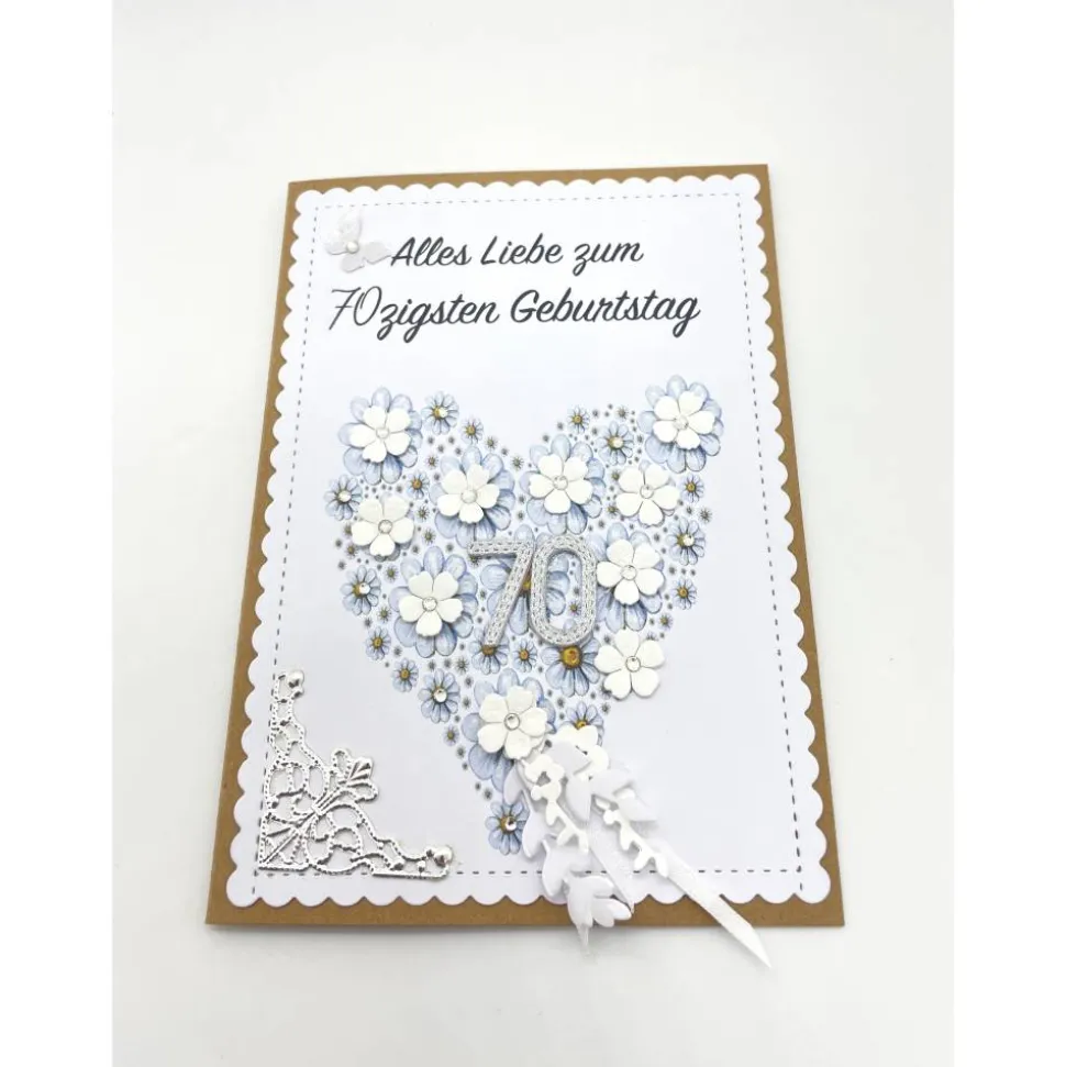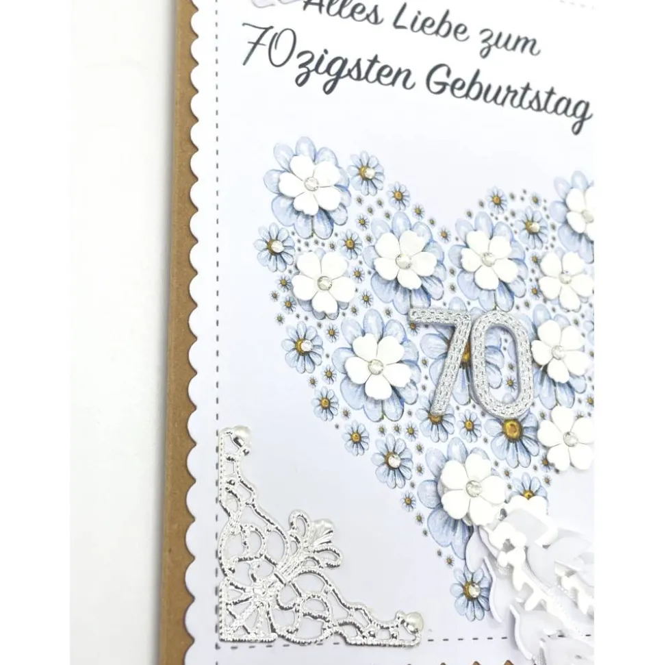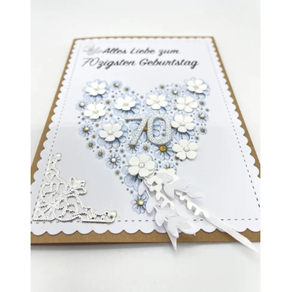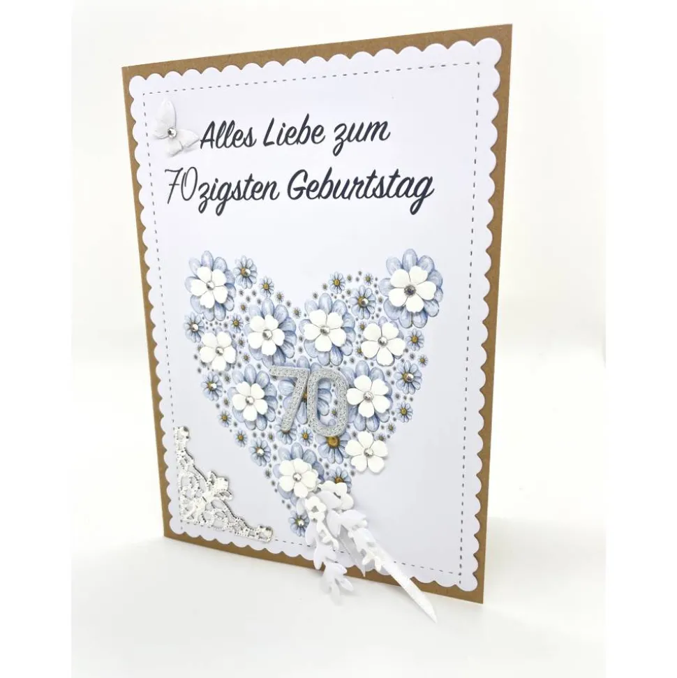 Entdecke eine einzigartige, handgefertigte Glückwunschkarte mit einem kunstvoll gestalteten Blumenherz und deiner gewünschten Zahl für einen besonderen Geburtstag oder ein Jubiläum. Jede Karte ist mit viel Liebe zum Detail gefertigt, veredelt mit einem Schleifenband, kleinen Blümchen und einem funkelnden Strassstein, der für einen edlen Glanz sorgt.