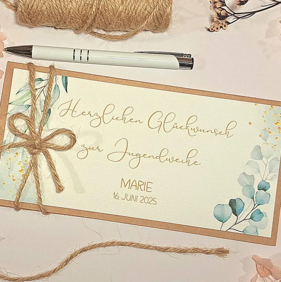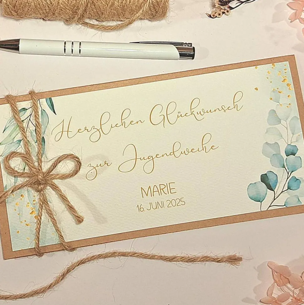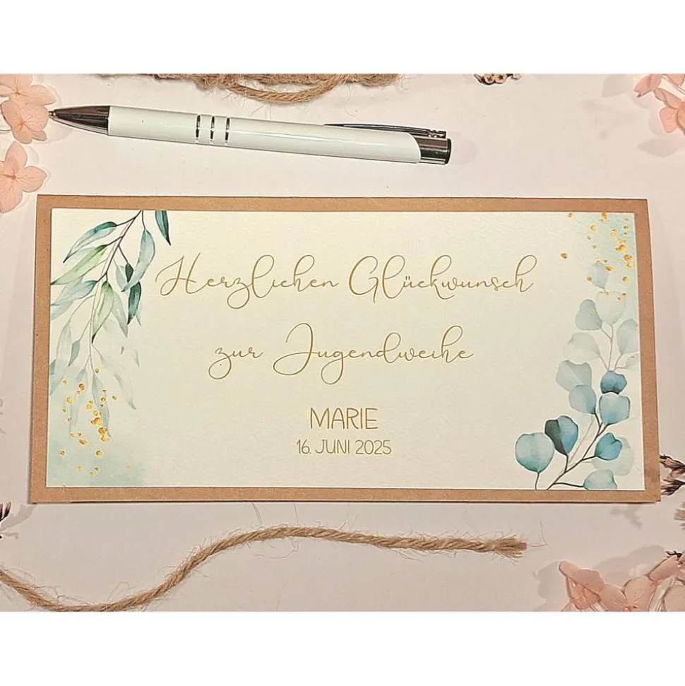 Diese personalisierte Glückwunschkarte ist die perfekte Wahl, um Geldgeschenke, Gutscheine oder Konzertkarten stilvoll zu überreichen. Die Karte wird in liebevoller Handarbeit aus hochwertigem Kraftkarton gefertigt und mit einer rustikalen Juteband-Schleife verschlossen. Das edle Aquarell-Blätter-Design macht sie zu einem einzigartigen Blickfang.
