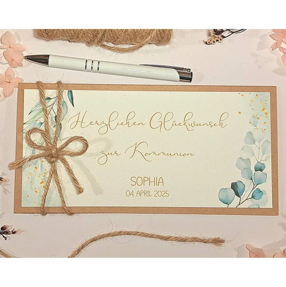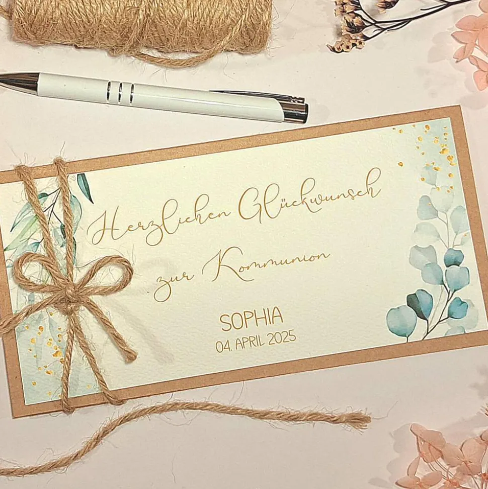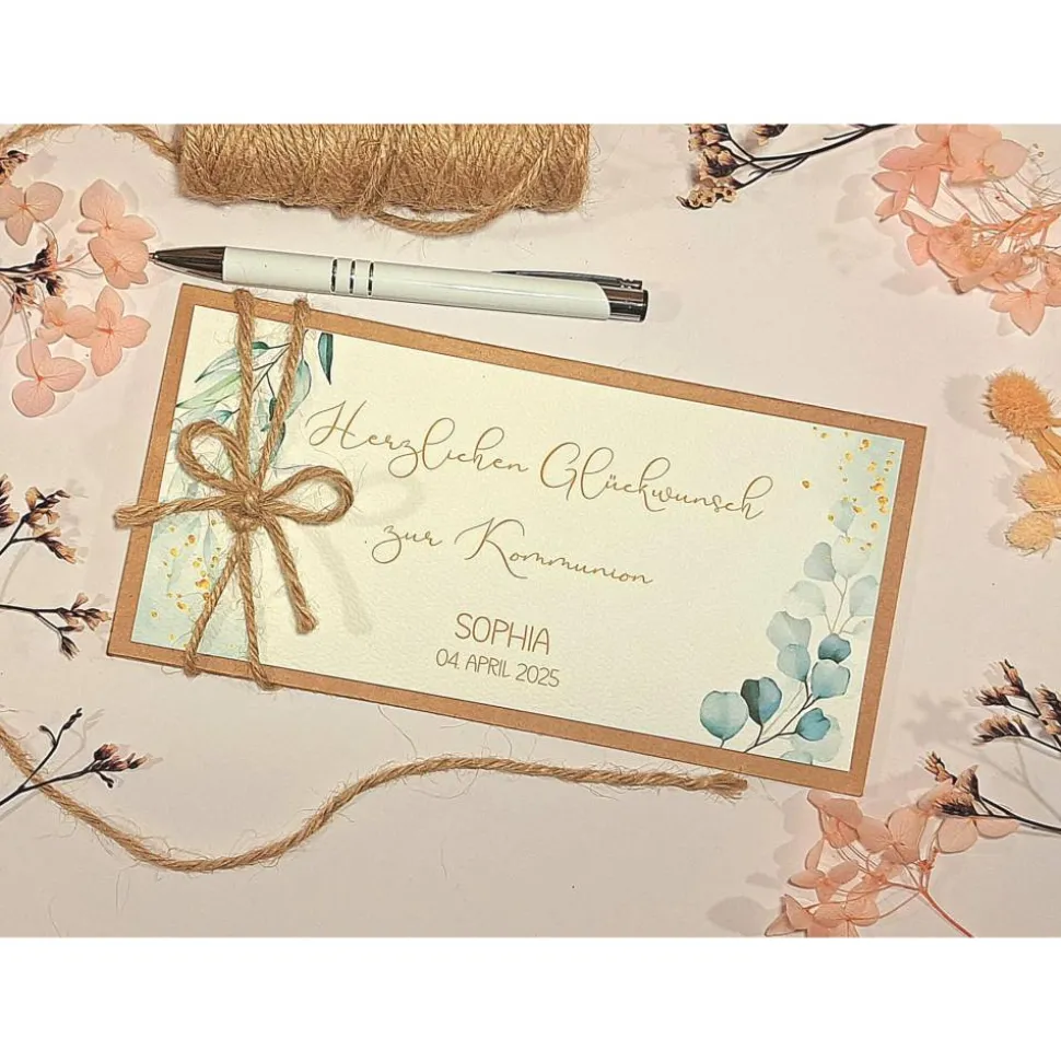 Überreiche zur heiligen Kommunion ein einzigartiges Geschenk: Unsere personalisierte Glückwunschkarte zur Kommunion ist die stilvolle und liebevolle Verpackung für Geldgeschenke, Gutscheine oder Konzertkarten. Gefertigt aus hochwertigem Kraftkarton und verschlossen mit einer rustikalen Juteband-Schleife, beeindruckt die Karte durch ihr edles Aquarell-Blätter-Design.