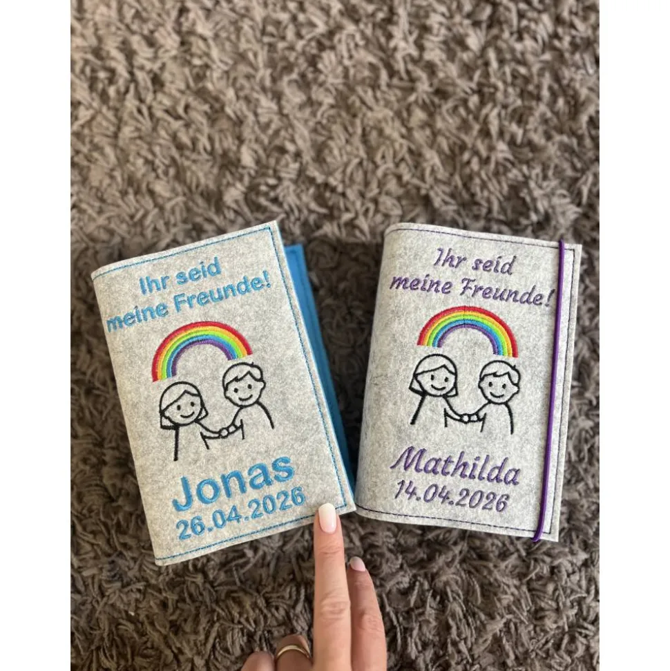 „Ihr seid meine Freunde!“ – das Thema der Kommunion 2026. Dieses Motiv der Gotteslobhülle ist brandneu und wurde von uns selbst entworfen und digitalisiert. Es ist einzigartig und nur bei Taeradesign erhältlich.