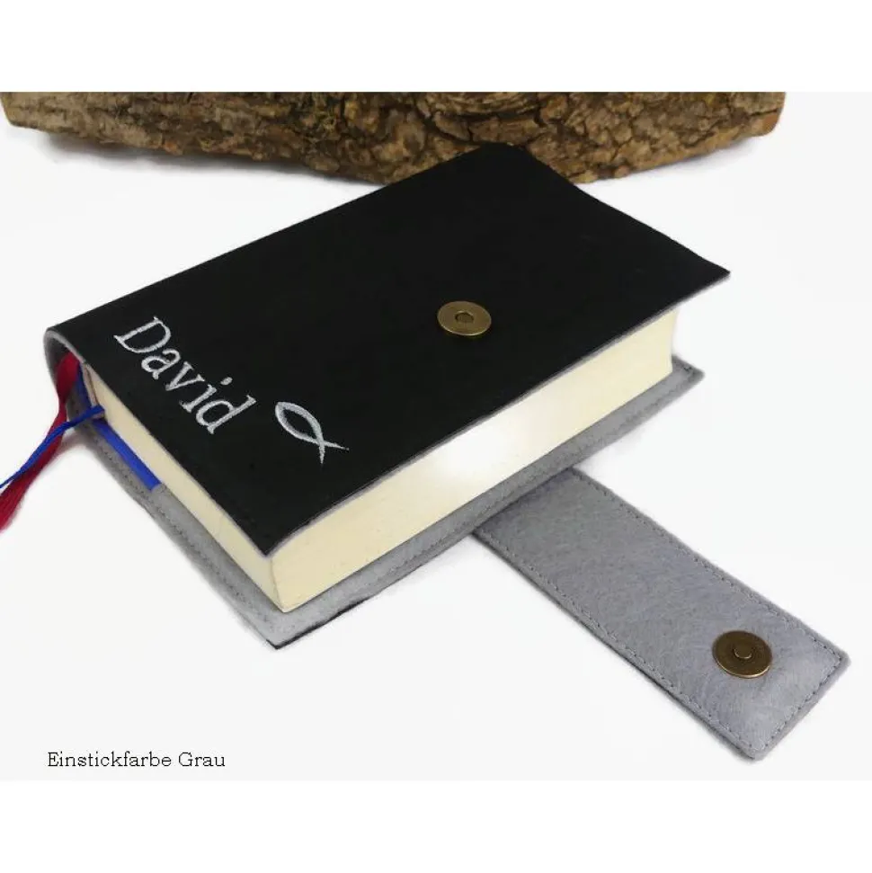 Gestalte dein Unikat: Lasse den Namen, ein Datum, einen Spruch oder Glückwünsche in deiner Wunschfarbe auf der Hülle oder innen im Einschlag einsticken. Wähle die Position der Stickerei: außen auf den Buchrücken (nur Vorname), auf der Vorderseite unten oder innen im Einschlag. Das Kreuz oder Fischsymbol wird in deiner gewählten Kontrastfarbe eingestickt, die meist auch für den Filz innen verwendet wird – alternativ ist auch schwarzer Filz möglich.