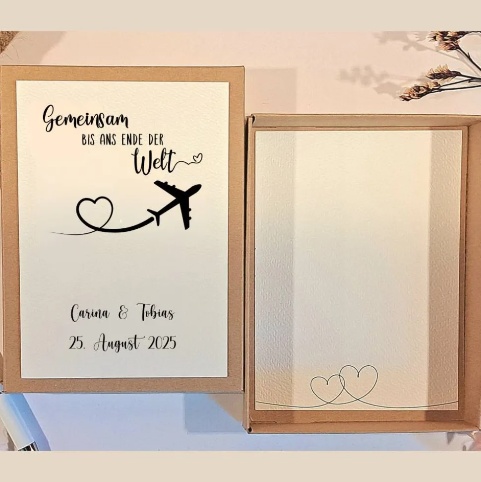 Verschenke zur Hochzeit ein echtes Highlight: Die personalisierte Hochzeitsbox „Gemeinsam bis ans Ende der Welt“ ist das perfekte Geldgeschenk für Paare, die von Flitterwochen und Abenteuern träumen!