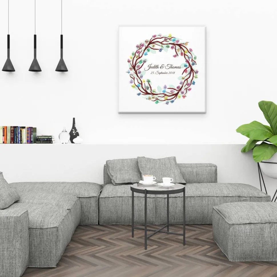 Mach deine Hochzeit unvergesslich! Diese personalisierte Gästebuch-Leinwand ist eine originelle Alternative zum klassischen Gästebuch. Gäste hinterlassen mit bunten Fingerabdrücken und ihrer Unterschrift ein einzigartiges Kunstwerk – ein Symbol für Liebe, Zusammenhalt und unvergessliche Erinnerungen.