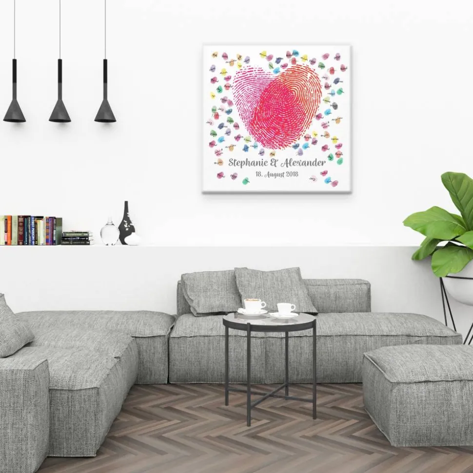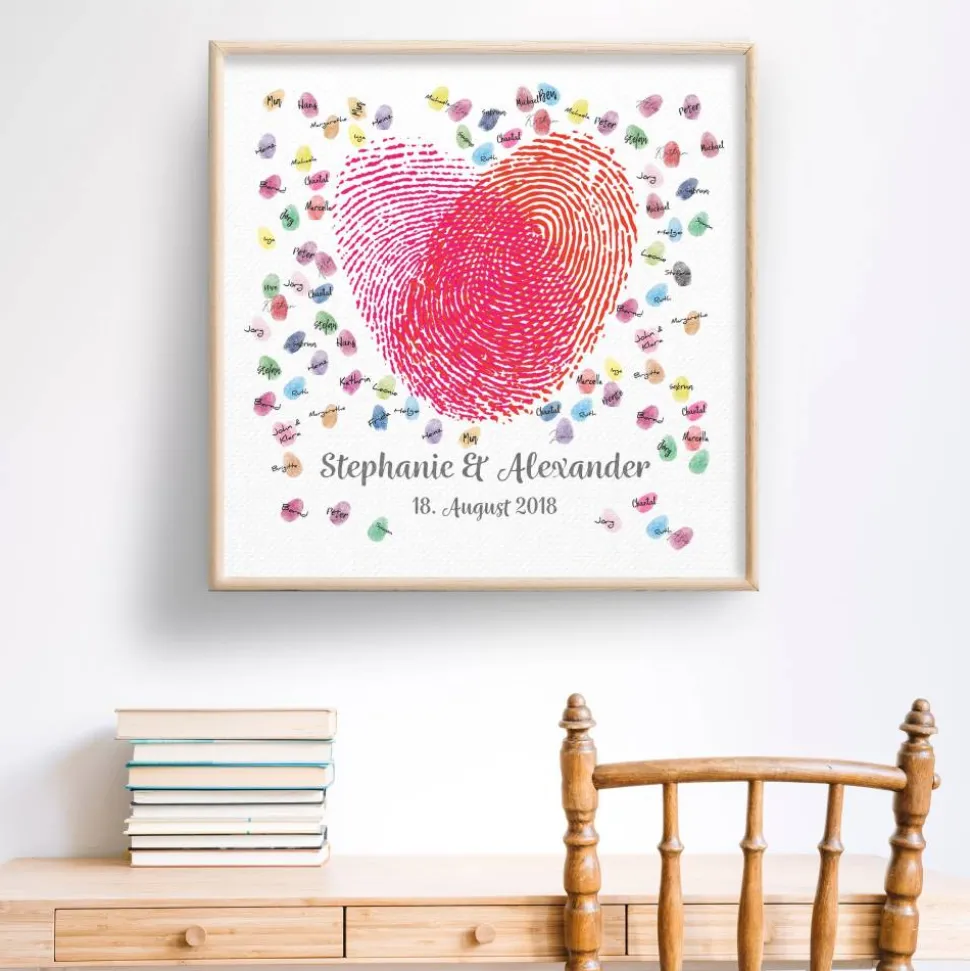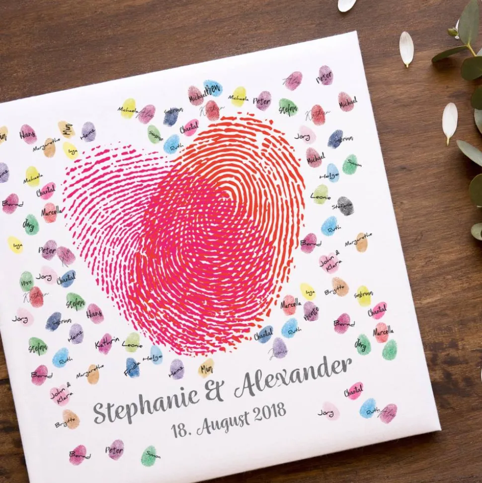 Die Gäste können mit Stempelkissen ihren Fingerabdruck auf der hochwertigen Leinwand hinterlassen und signieren. Ein einzigartiges und individuelles Hochzeitsgeschenk und Spaß auf der Hochzeitsfeier, welches noch lange in Erinnerung bleibt.