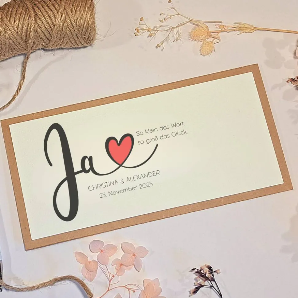 Überrasche das Brautpaar mit einer einzigartigen und liebevoll handgemachten Hochzeitskarte! Die elegante personalisierte Hochzeitskarte „Ja“ begeistert durch das große geschwungene Schriftmotiv mit integriertem roten Herz und dem Zitat „So klein das Wort, so groß das Glück“ – ein echter Hingucker für jeden Anlass.