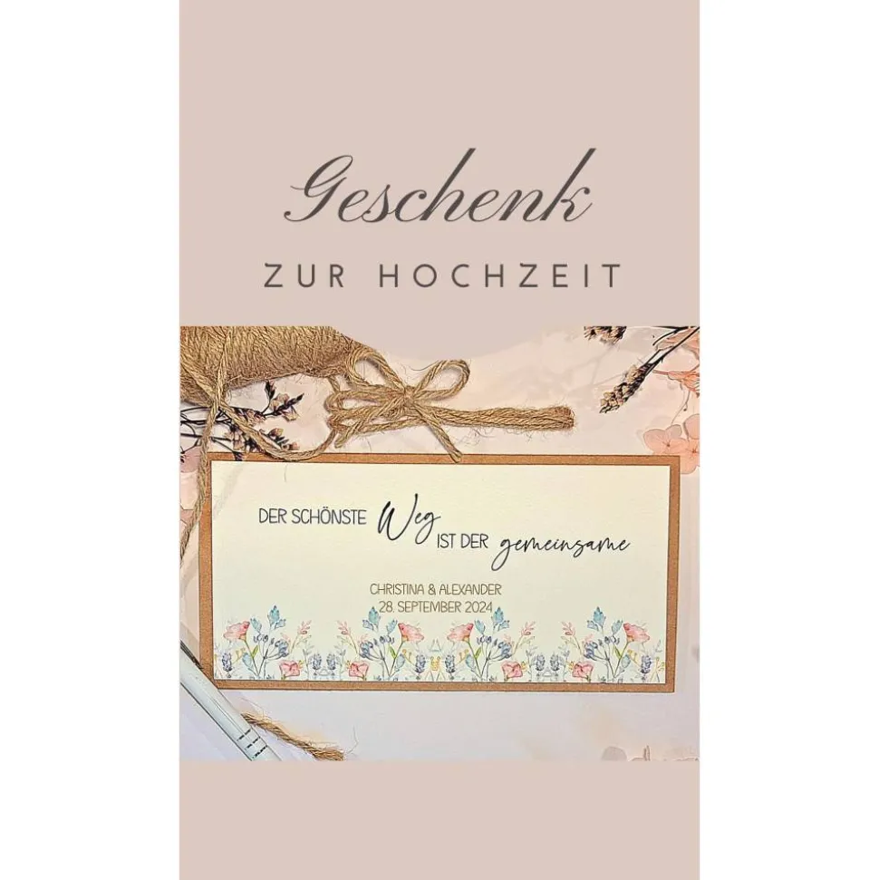 Diese handgefertigte Klappkarte im floralen Sommer-Design bietet dir eine stilvolle Möglichkeit, Geld oder Gutscheine zur Hochzeit zu verschenken. Sie wird individuell mit den Namen des Brautpaars und dem Hochzeitsdatum personalisiert und ist damit ein echtes Unikat für einen unvergesslichen Tag.
