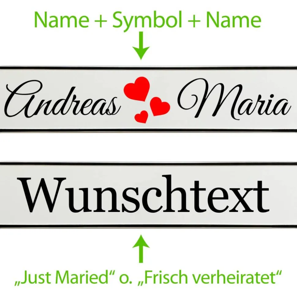 Stell dir vor, wie das Brautauto mit einem Schild glänzt, das eure Namen oder euren Wunschtext trägt. Damit wird dein Hochzeitsauto zur Bühne für den großen Auftritt.