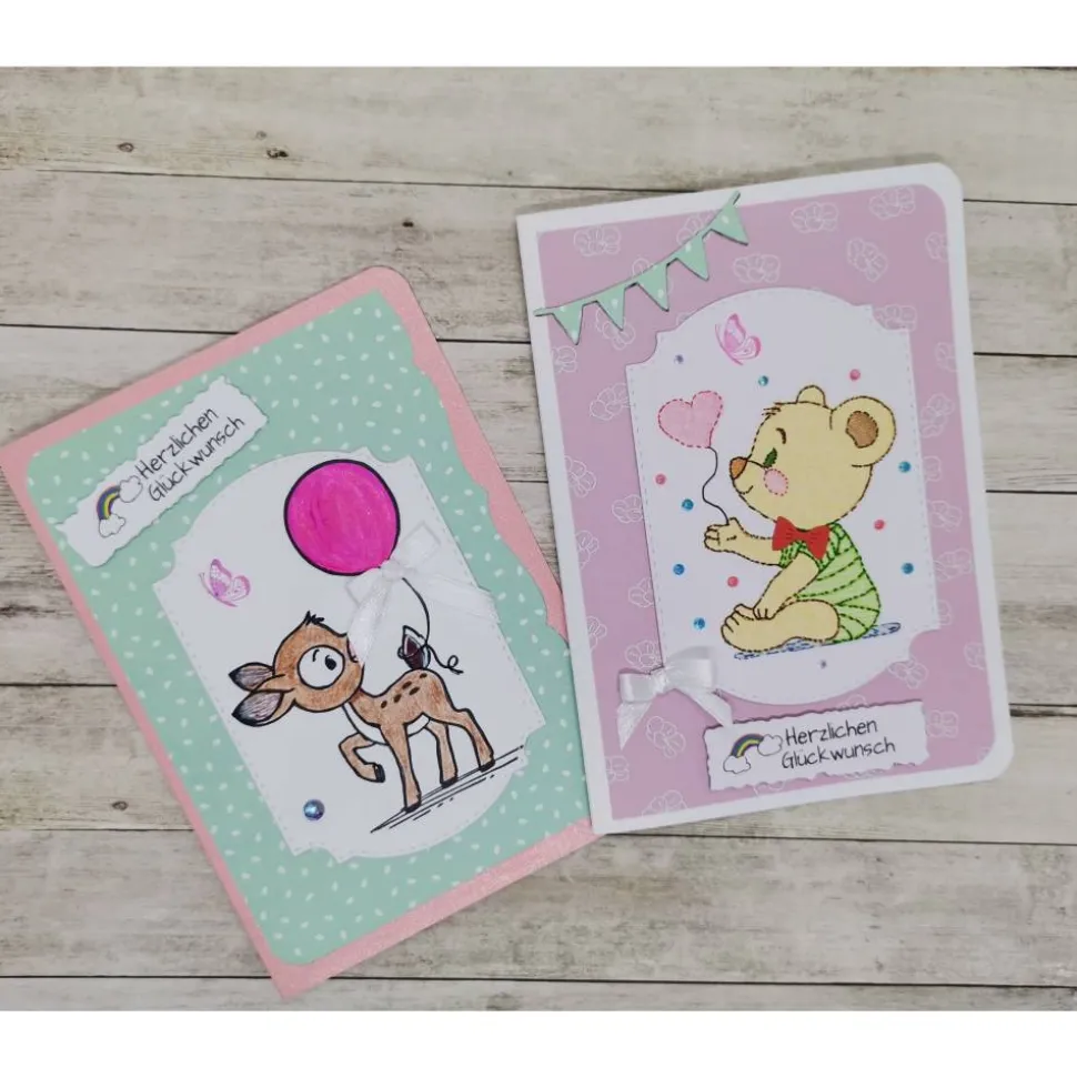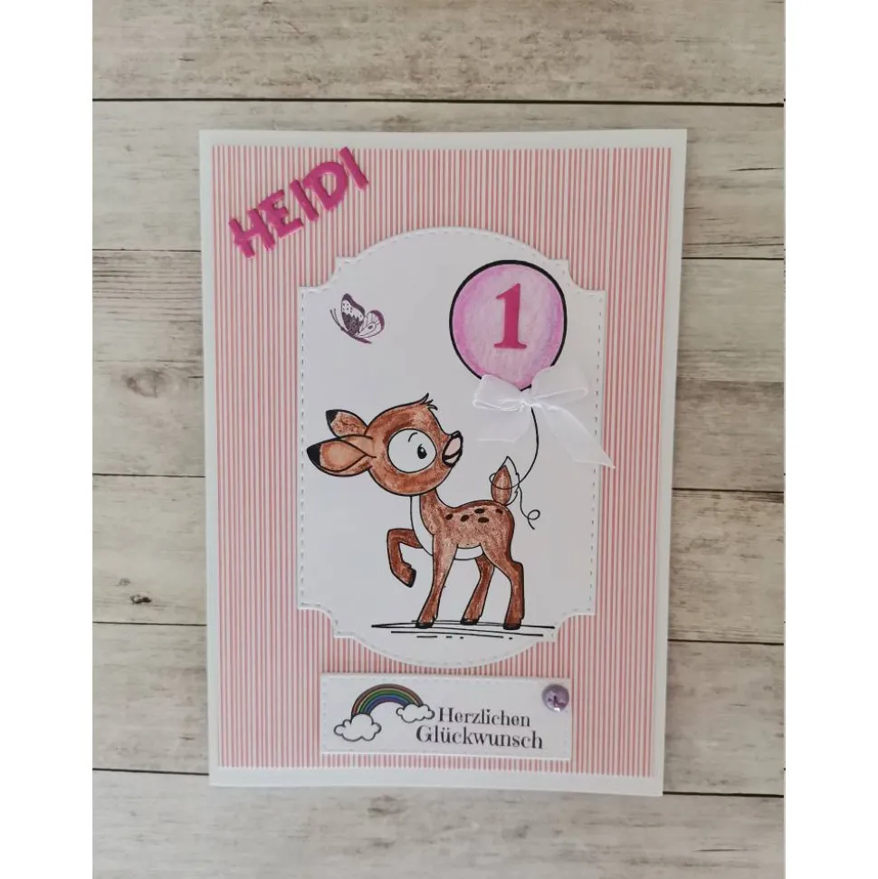 Mit Liebe handgefertigte Kindergeburtstagskarte – überreiche eine ganz besondere Grußkarte mit niedlichem Rehkitz oder Teddybär, die du individuell mit Name, Alter und Wunschtext gestalten kannst.