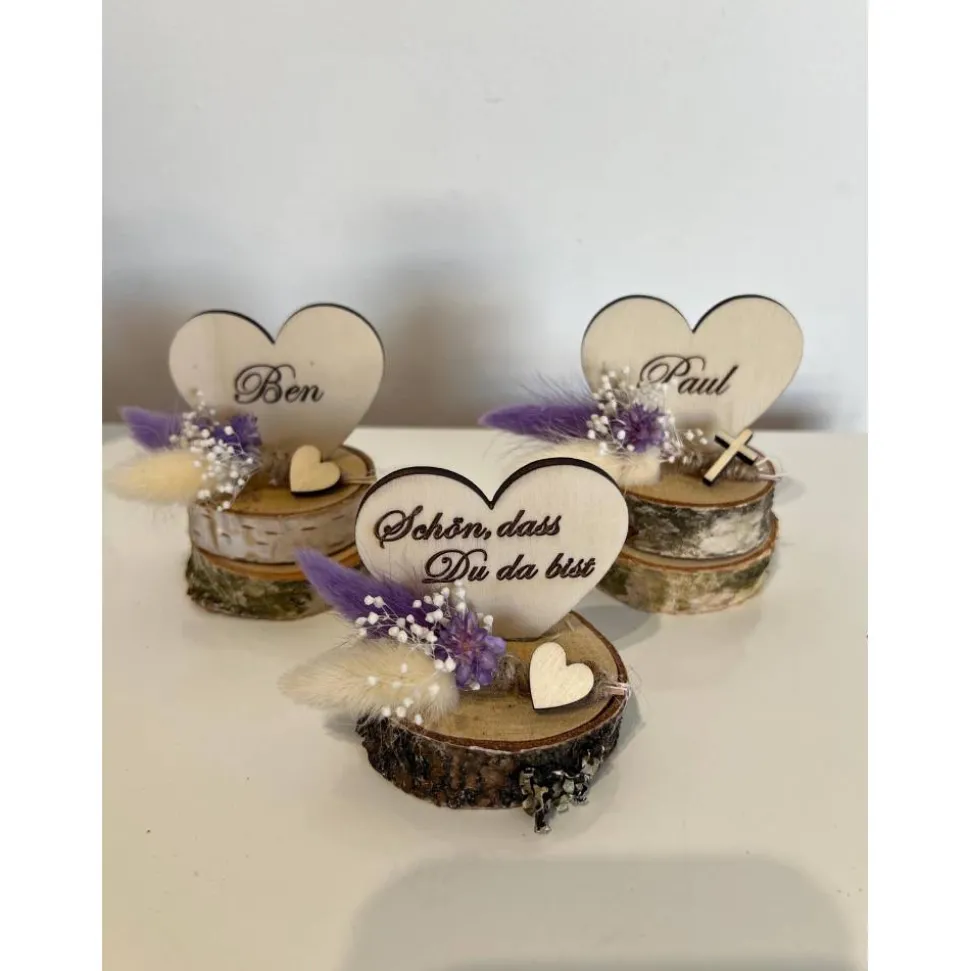 Die Namensschilder werden ausgelasert, auf eine kleine Birkenscheibe geklebt und mit Trockenblumen und einer Streudeko deiner Wahl dekoriert. Verpackt wird jedes einzelne in einem kleinen Karton.