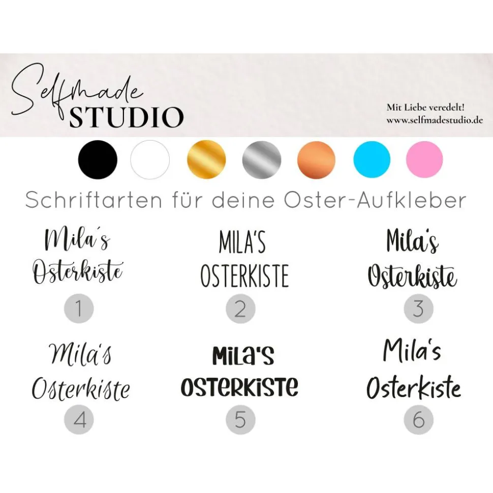 Wähle aus verschiedenen Schriftzugfarben wie Weiß, Schwarz, Gold, Silber, Kupfer, Blau oder Rosa. Gib deinen Wunschnamen an und personalisiere den Schriftzug auf deiner Osterbox, z.B. „Osterkiste für Wunschname“, „Osternest von Wunschname“ oder „Frohe Ostern Wunschname“.