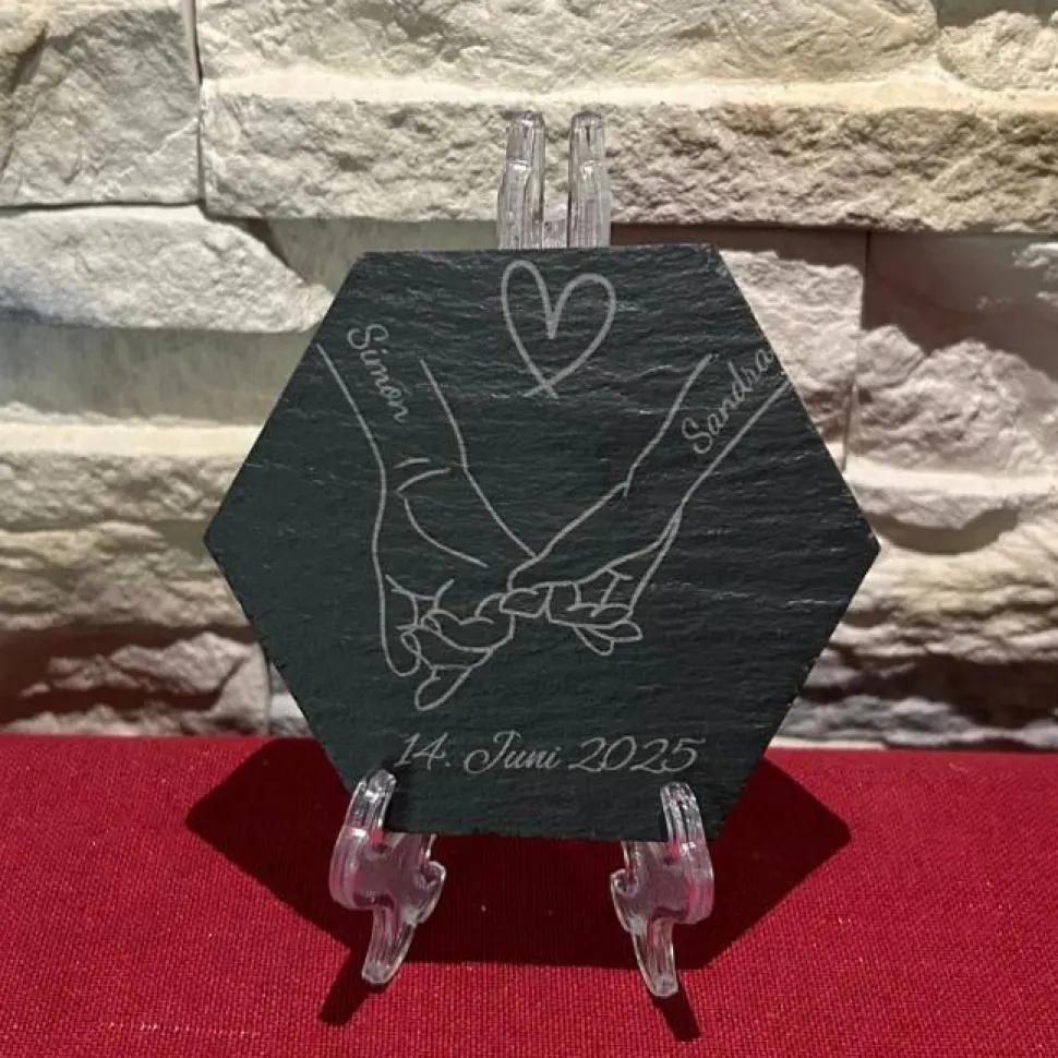 Ein Symbol der Verbundenheit: Zwei Hände, die sich festhalten – verewigt in feiner Gravur auf echtem Schiefer.