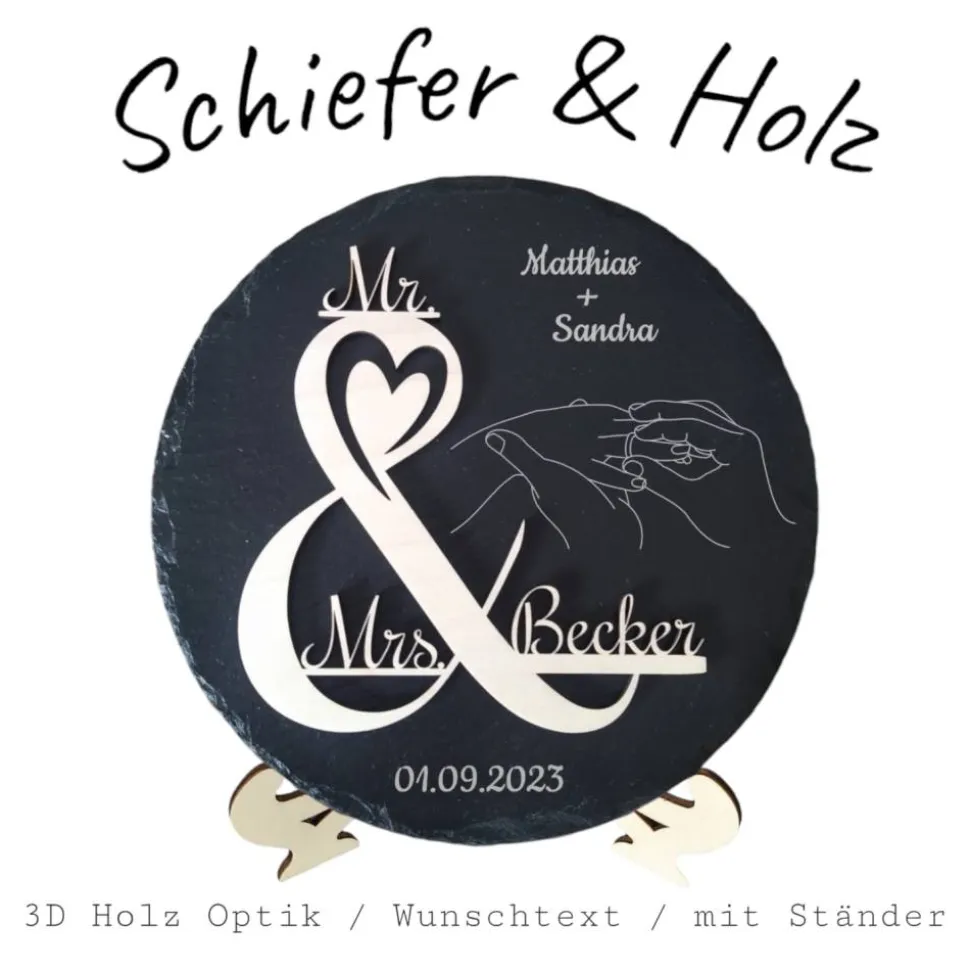 Unsere 20 cm große Schiefertafel sticht durch ihre filigrane 3D-Holzstruktur hervor. Das Motiv „Mr. & Mrs.“ wird aus echtem Holz präzise gelasert. Das Beste: Sie können den Nachnamen, die Vornamen und das Hochzeitsdatum individuell gestalten lassen! So wird die Tafel zu einem Unikat, das nicht nur gut aussieht, sondern auch emotional berührt.