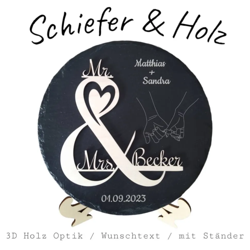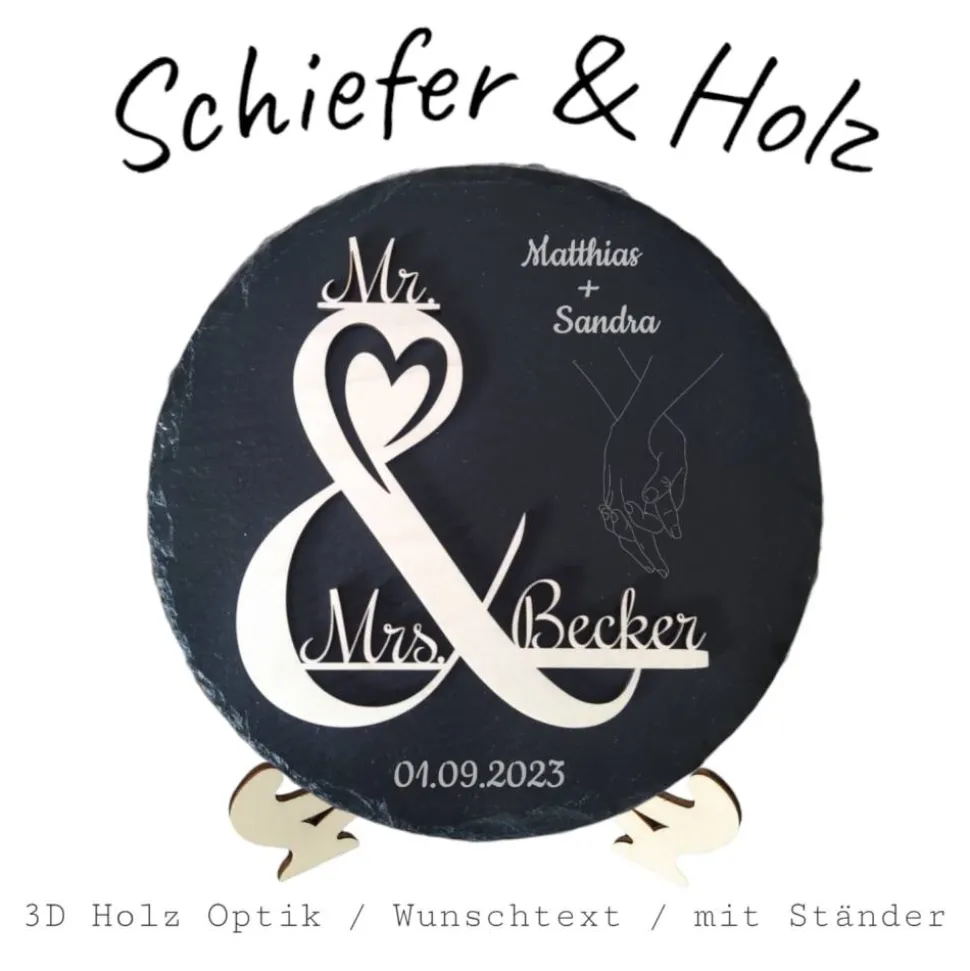 Personalisierte Schiefertafel mit 3D-Holzgravur – Perfekt als Geschenk für Hochzeit, Verlobung, Hochzeitstag