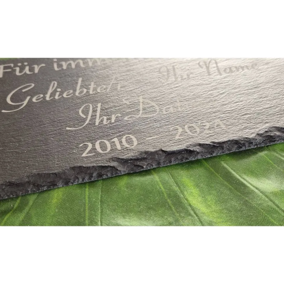 Der robuste Naturschiefer ist besonders wetterfest, langlebig und pflegeleicht. Die Oberfläche wird zusätzlich mit Klarlack versiegelt, sodass die Gravur dauerhaft geschützt bleibt. Jede personalisierte Schieferplatte ist ein Unikat – ein einzigartiges Zeichen der Erinnerung, des Gedenkens und der Wertschätzung.