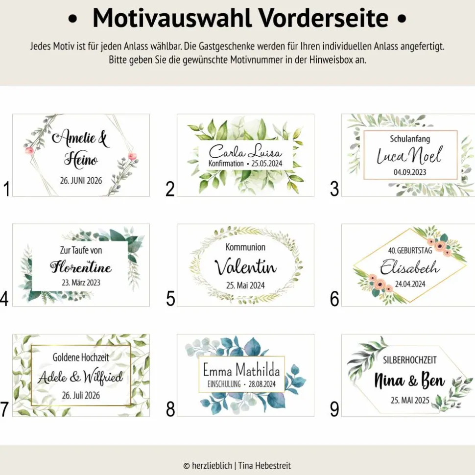Wählen Sie einfach Ihre gewünschte Stückzahl und teilen Sie im Kommentarfeld Ihre Wunschdaten mit (Motivnummer Vorderseite, Motivauswahl Rückseite, Anlass, Name, Datum). Nach Erhalt Ihrer Angaben erhalten Sie einen Korrekturabzug zur Prüfung. Erst nach Ihrer Druckfreigabe fertige ich Ihre Wunschartikel an.