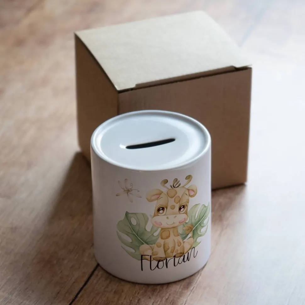 Personalisierte Spardose *Safari Tiere – Giraffe* aus Keramik mit Name / Geschenk für Kinder zur Einschulung