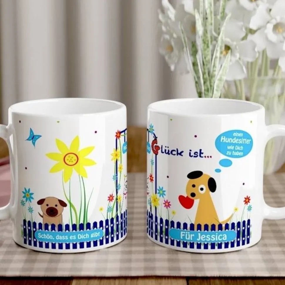 Die fröhlich-bunte Tasse begeistert mit lustigen Hunden und herzlichen Sprüchen wie „Glück ist, einen Hundesitter wie dich zu haben“ oder „Schön, dass es Dich gibt“. Mit deinem eigenen Wunschtext auf der Vorderseite wird jeder Kaffeebecher zu einem ganz persönlichen Highlight. Wähle deine Lieblingsfarbe und überrasche deinen Hundeaufpasser mit einem einzigartigen und individuellen Präsent.