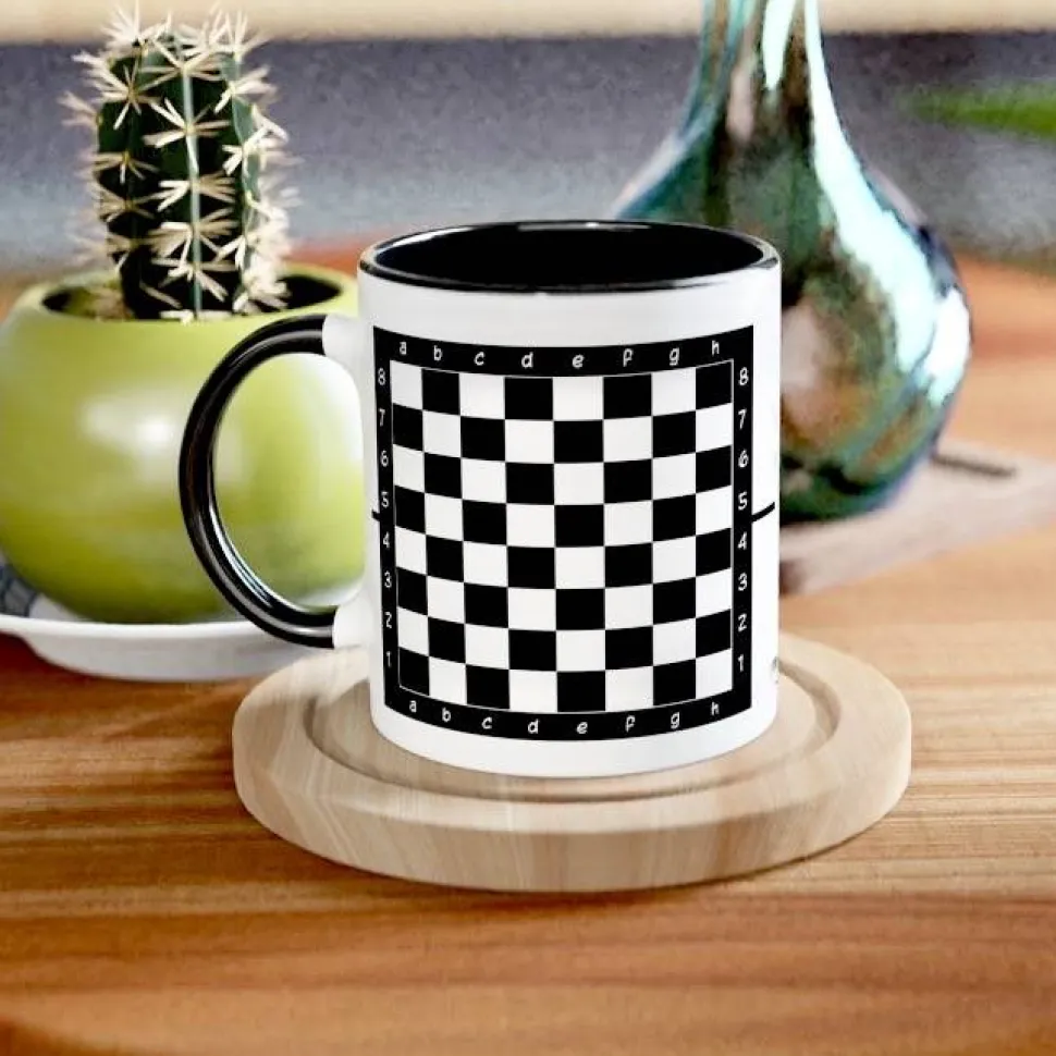 – Der Kaffeebecher hat beidseitig ein Schachbrett.