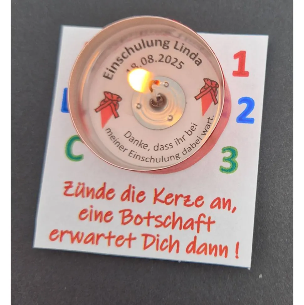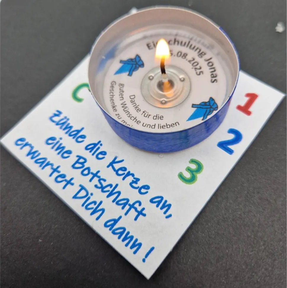 Individuell gestaltet: Dein Teelicht wird mit dem Namen des Kindes, dem Einschulungsdatum und einer persönlichen Dankesbotschaft versehen. Im Inneren verbirgt sich ein Papiereinleger mit deiner individuellen Nachricht, die beim Anzünden sichtbar wird.