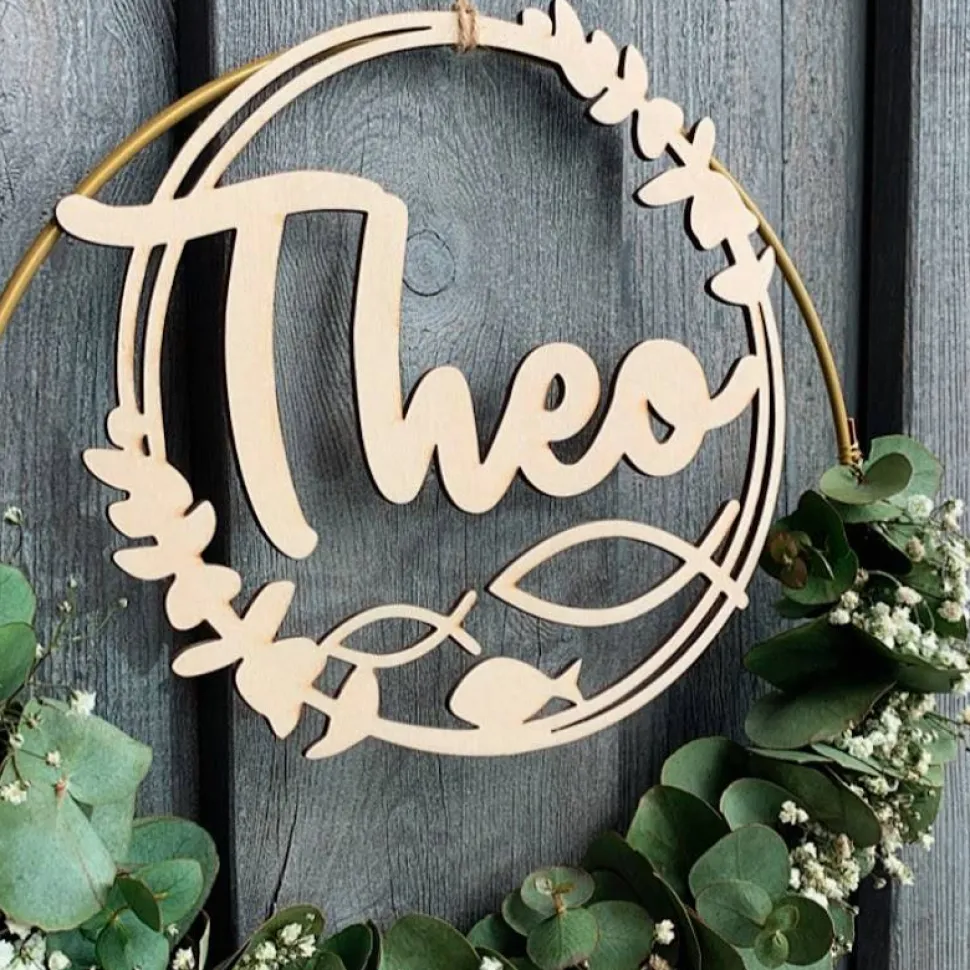 Das Schild hat einen Durchmesser von 20 cm und wird aus 3 mm starken, unbehandelten Birkenholz gefertigt. Zur Vervollständigung des Kranzes eignen sich insbesondere Trockenblumenkränze mit einer Größe von circa 30 cm.