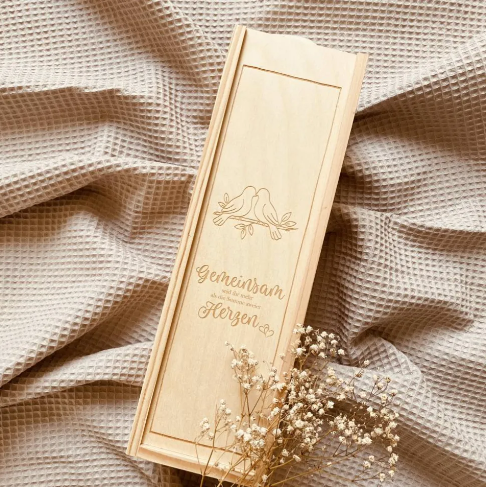 *Die Weinflasche und Dekoration sind nicht mit in der Lieferung enthalten. Es wird nur die gravierte Weinkiste geliefert.*