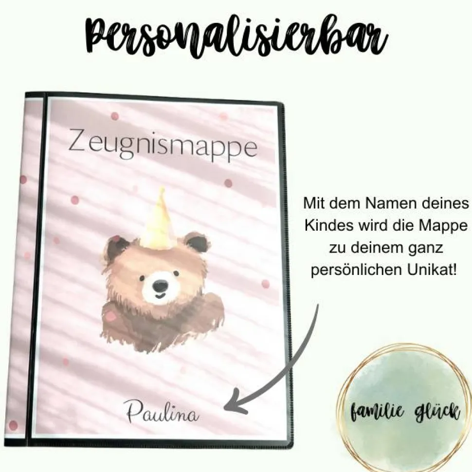 Personalisierte Zeugnismappe mit Name, rosa mit Bärchen, Geschenk Einschulung, Schulkind, Zeugnisordner, Schulstart, Map