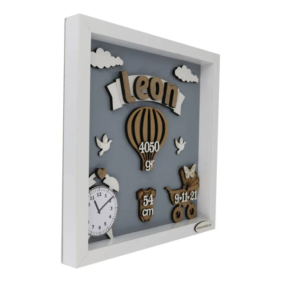 Schicker tiefer Bilderrahmen in der Farbe Grau mit Rahmenhalter. Die Figuren und der Rahmen sind aus Holz (MDF). Die Größe ist 30cm x 30 cm x 3 cm.