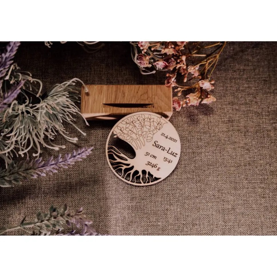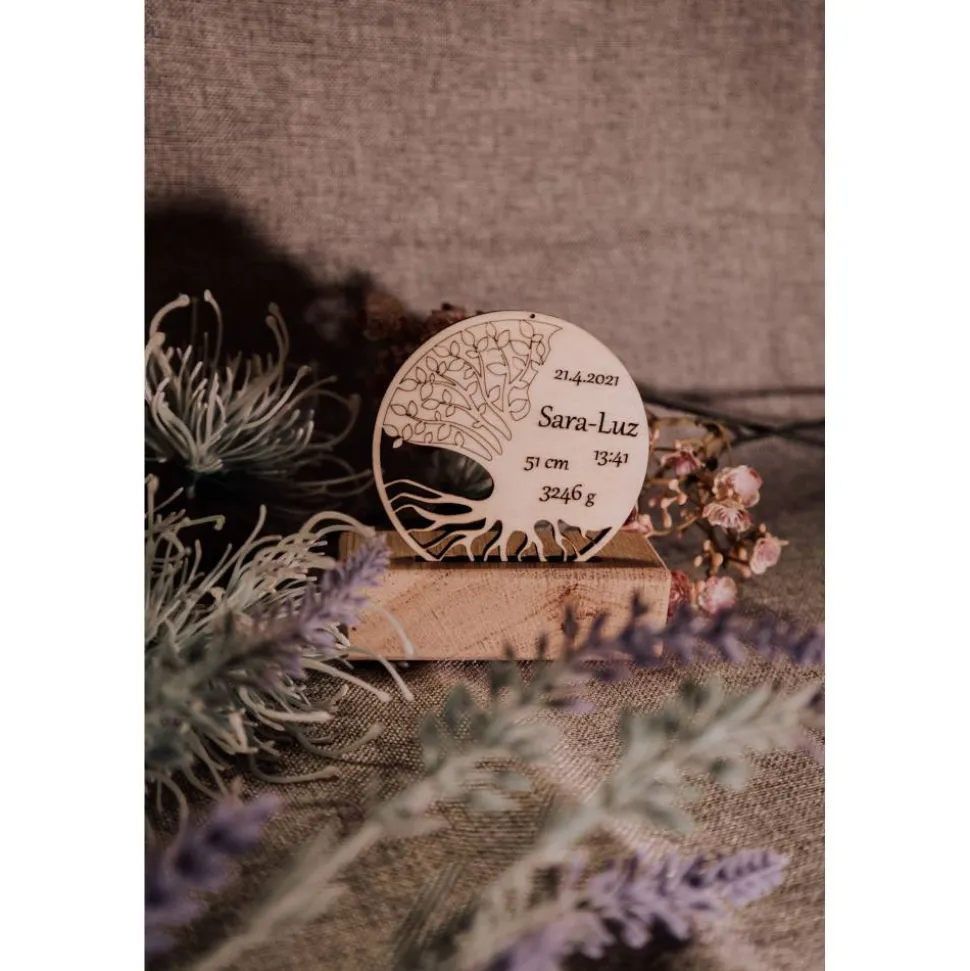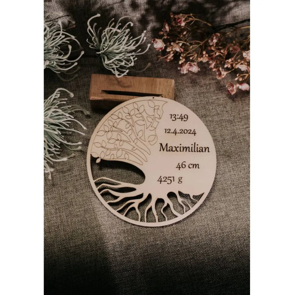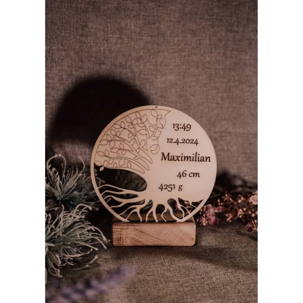 Das Motiv kombiniert mit den Geburtsdaten eines Kindes verbindet symbolische Bedeutung mit persönlicher Note.