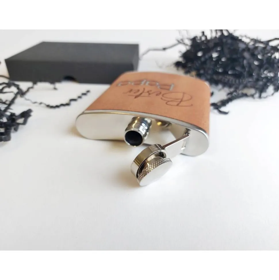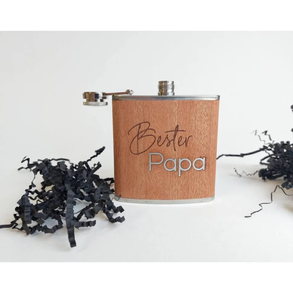 Verschenke einen einzigartigen Flachmann „Bester Papa“ – ein edles und persönliches Geschenk für besondere Anlässe. Der Flachmann besteht aus hochwertigem Edelstahl und ist mit einer eleganten Holz-Oberfläche veredelt. Durch die individuelle Gravur mit Wunschwort, wie zum Beispiel „Papa“, „Mama“ oder „Opa“, erhältst du ein Unikat, das garantiert Eindruck macht.