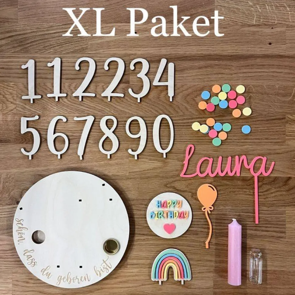 Unsere Holzprodukte können Abweichungen in Maserung und Farbe aufweisen. Diese sind naturbedingt und stellen keinen Reklamationsgrund dar. Die Konfetti (nur im XL-Paket enthalten) werden mit einem Laser hergestellt und können auf einer Seite Schmauchspuren enthalten. Die Schmauchspuren auf den Konfettis lassen sich jedoch einfach mit einem handelsüblichen Fettreiniger entfernen.