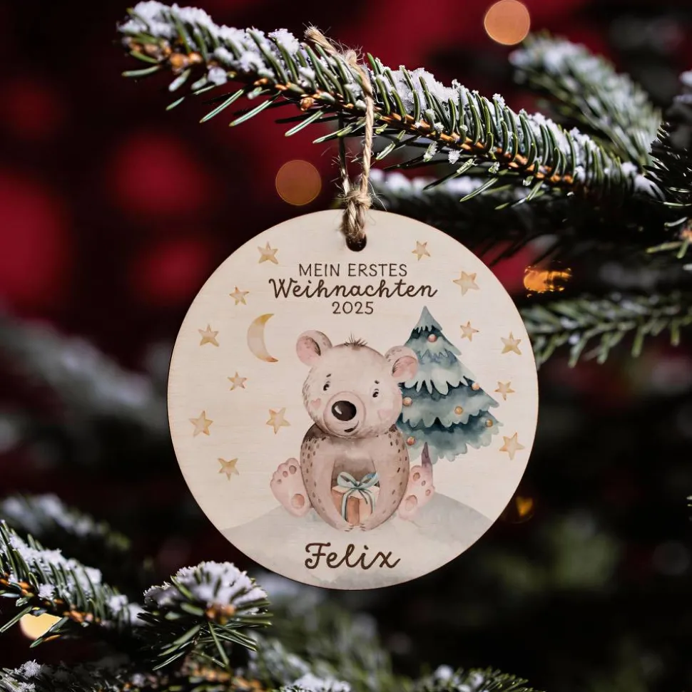 Personalisierter weihnachtlicher Anhänger aus Holz mit einem süßen Bären für das erste Weihnachten mit den Kleinsten.