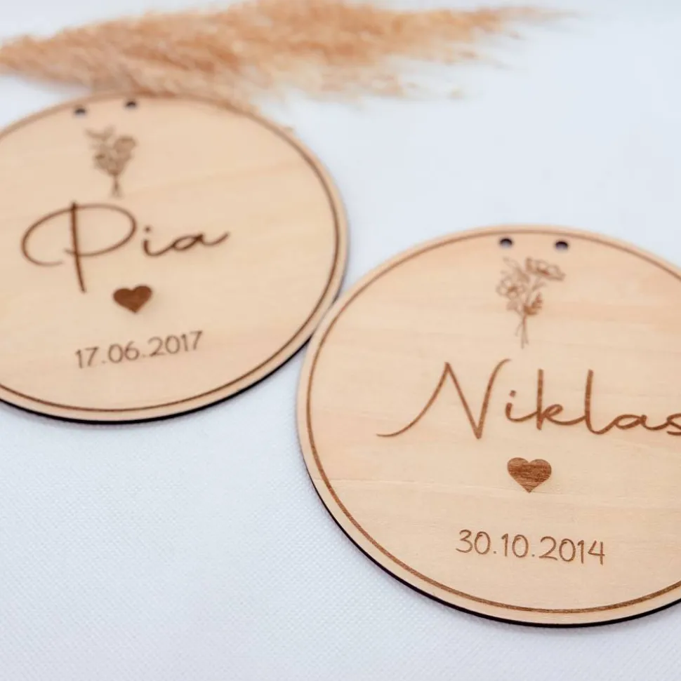 Dieser Holzaufhänger hält diesen besonderen Moment liebevoll fest – mit dem Namen des Babys, dem Geburtsdatum und der Geburtsblume, die den Monat symbolisiert, in dem das Kind geboren wurde.