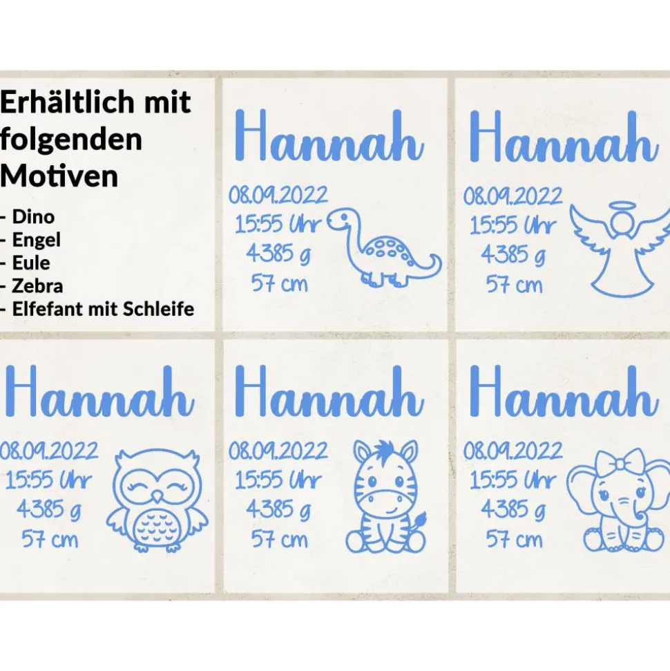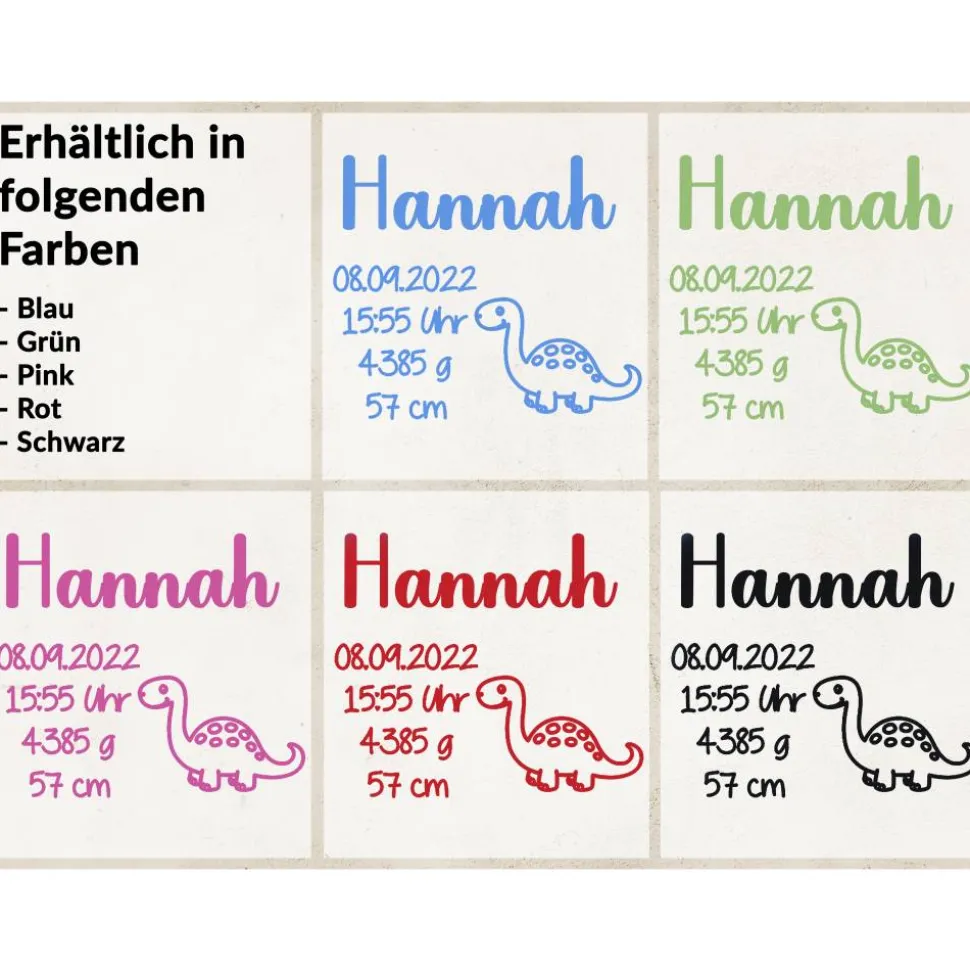 Name, Geburtstag, Uhrzeit, Gewicht, Größe, Schriftfarbe und Wunschmotiv