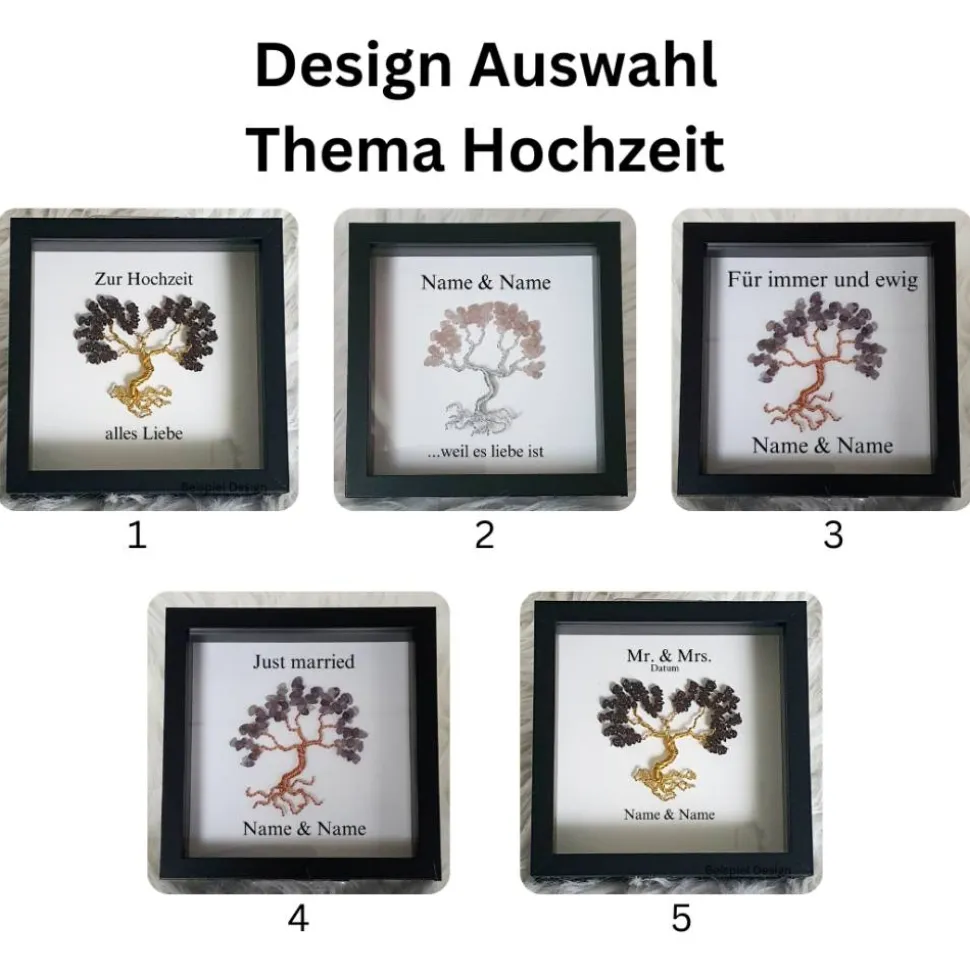 Sie können sich Ihren Edelsteinbaum ganz nach Ihren Wünschen anfertigen lassen. Da ich jeden Edelsteinbaum von Hand fertige kann ich solche Wunsch berücksichtigen. Die Bilder zeigen Ihnen wie der Edelsteinbaum ungefähr aussehen würde. Da jeder Edelsteinbaum ganz individuell gefertigt wird, sieht jeder anders aus. Für den Edelsteinbaum verwende ich fast 3 Meter Draht und zwischen 60 und 100 Edelsteinsplitter. Den ich von Hand mit speziellen Techniken biege und drahte. Um dieses Design zu fertigen. Sobald der Edelsteinbaum fertig ist wird dieser von mir in den 3D Bilderrahmen eingesetzt. Diesen können sie dann hinstellen oder anhängen.