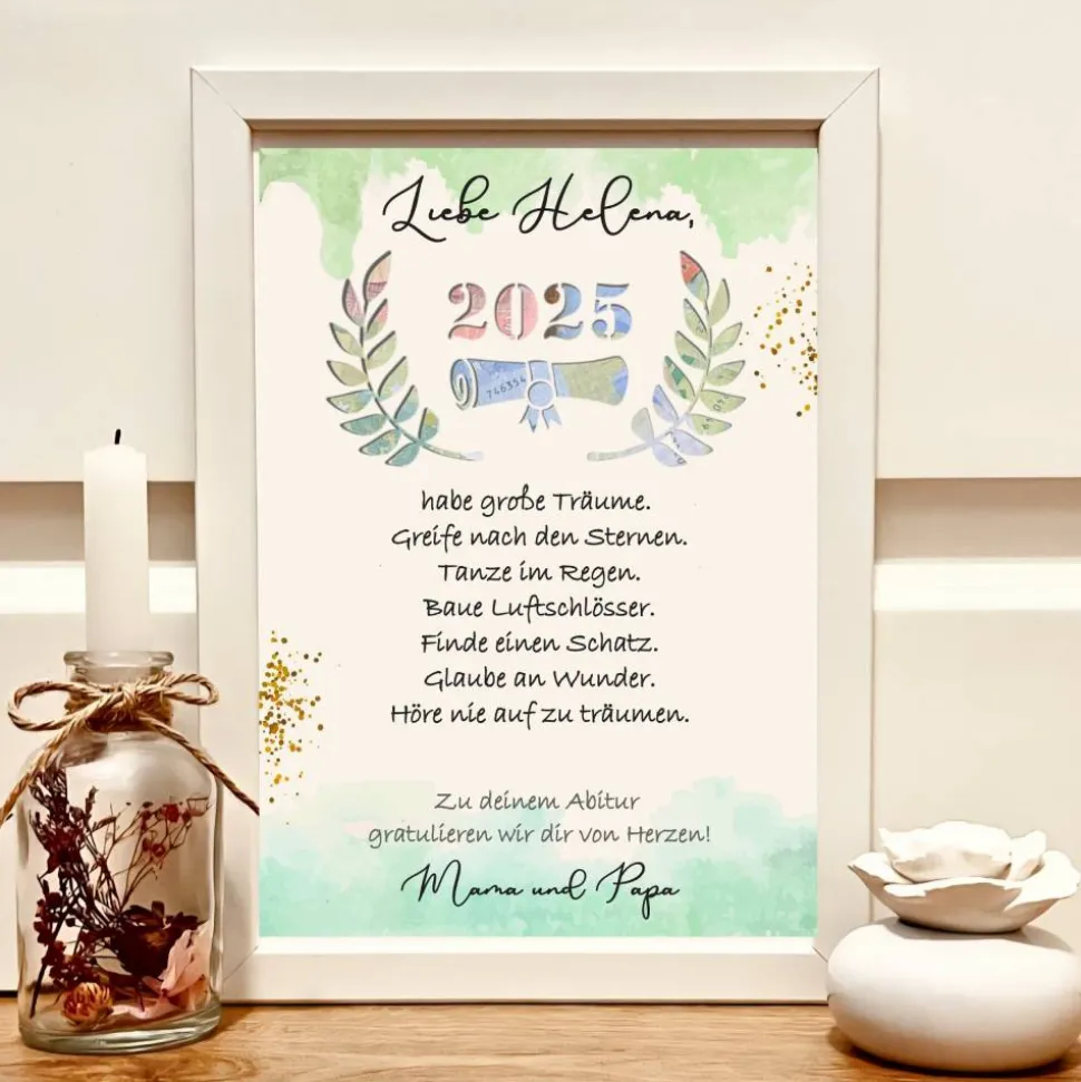 Motivierendes Design: Das stilvolle Blätter-Motiv, die Jahreszahl, eine Urkunde und der Spruch „Höre nie auf zu träumen“ machen das Geschenk zum inspirierenden Blickfang. Es motiviert für den nächsten Lebensabschnitt und bleibt auch ohne Geld ein dekorativer Hingucker.