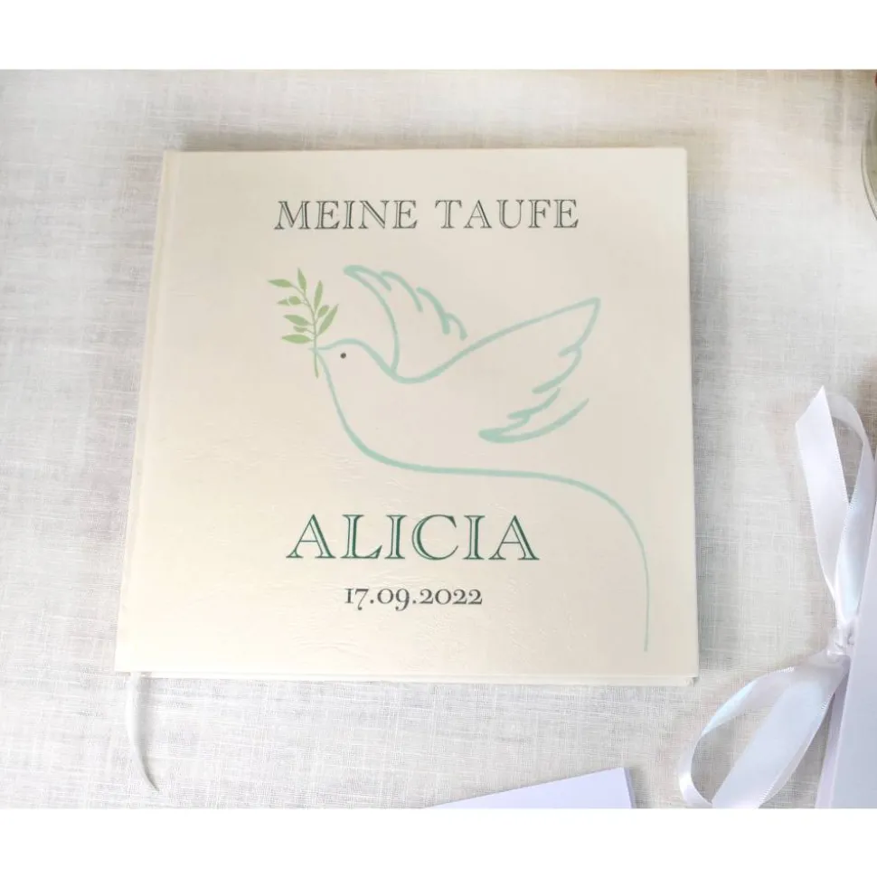 Personalisiertes Gästebuch & Taufalbum mit Taube und Olivenzweig zur Taufe mit Gästefragen oder Blanko