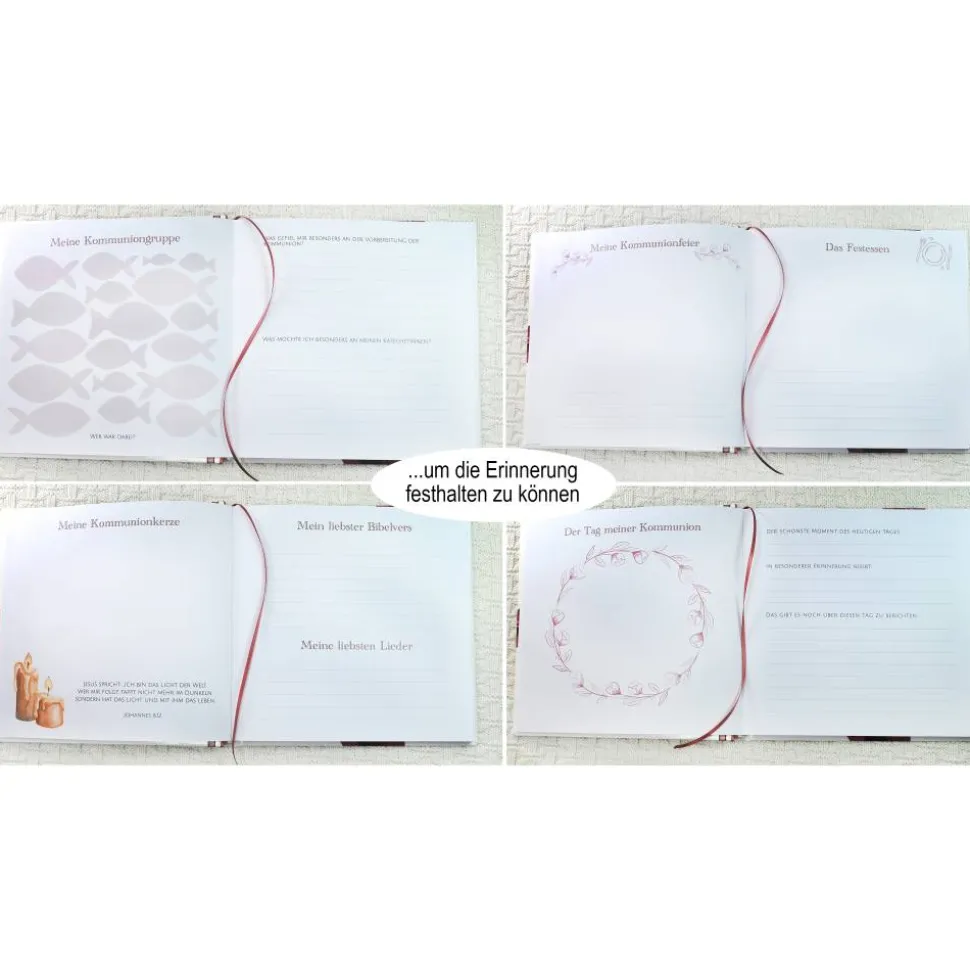 Das personalisierte Kommunionbuch wird mit viel Liebe und Sorgfalt in reiner Handarbeit für euch gefertigt. Das Kommunionalbum kann als Blanko-Variante oder mit Fragen zum Ausfüllen angefertigt werden. Beide Varianten bieten euch und euren Gästen viel Platz für eigene Worte und viele Fotos. Satinbänder zum Schnüren und ein Leseband veredeln das persönliche Gästebuch.
