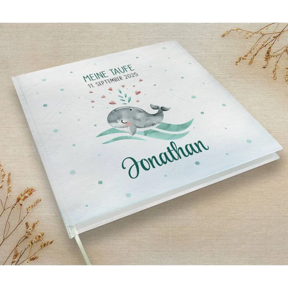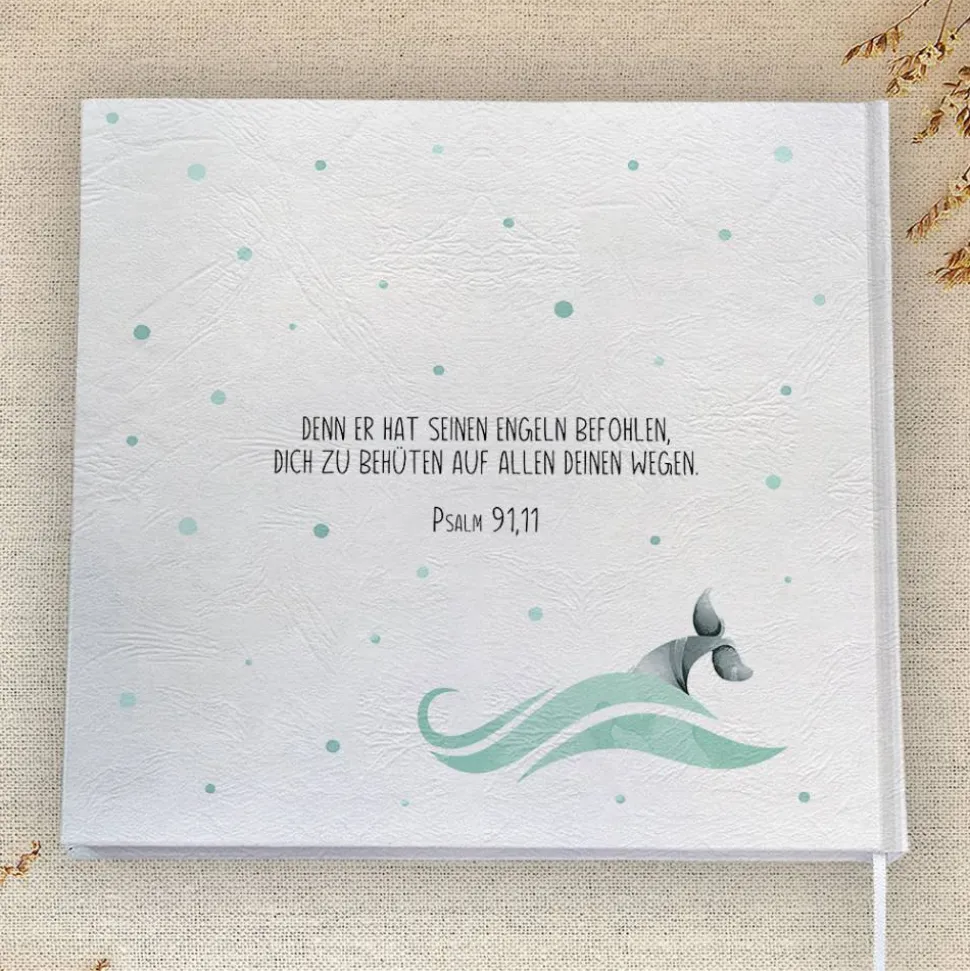 Das Cover zeigt ein zartes Aquarell eines kleinen Wals, umgeben von sanften Meereswellen, Punkten und Herzen in harmonischen Farbtönen – Grau, Hellblau und Altrosa. Der Name des Taufkindes sowie ein individueller Spruch oder Taufspruch machen das Album zu einem ganz besonderen Unikat.